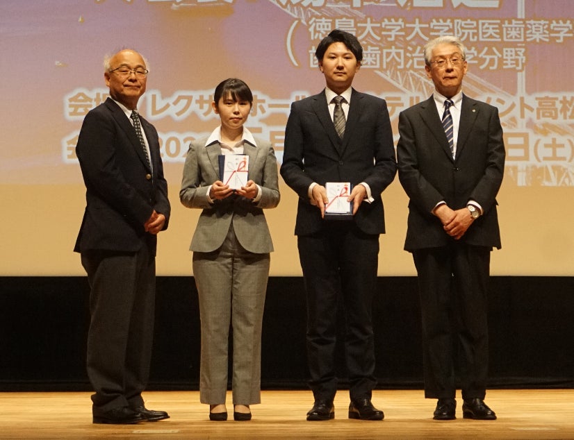受賞者は日本歯科大学生命歯学部歯周病学講座 宮下 幸大(みやした ゆきひろ)氏と九州大学大学院歯学研究院口腔機能修復学講座歯周病学分野 林 千華子(はやし ちかこ)氏の2名です。お二人には日本歯周病学会理事長 沼部 幸博氏から日本歯周病学会本賞のYoung Investigator Awardの盾と、サンスター執行役員 森茂樹より副賞のSUNSTAR Awardの賞金が贈られました。