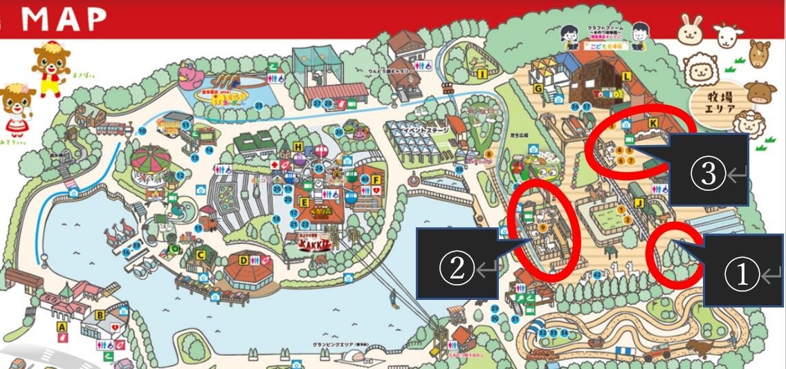 マップ② どうぶつふれあい広場内 ・・・ ヤギ または ヒツジの赤ちゃん