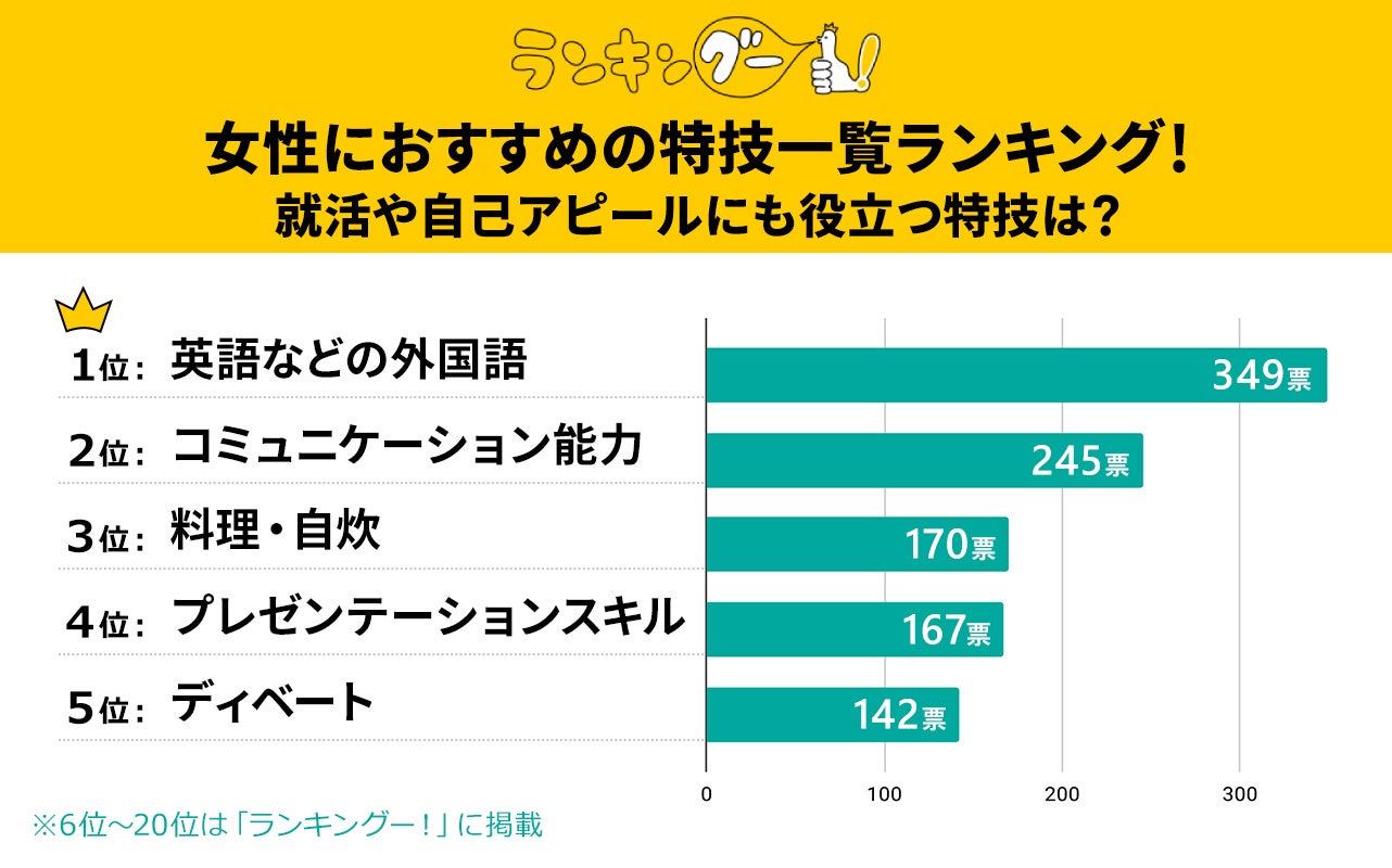 ランキングー!では女性におすすめの特技をピックアップし、ランキングを調査。全年代の女性2,776名にアンケートを行い、TOP20を決定しました。ここではTOP5をご紹介します。
