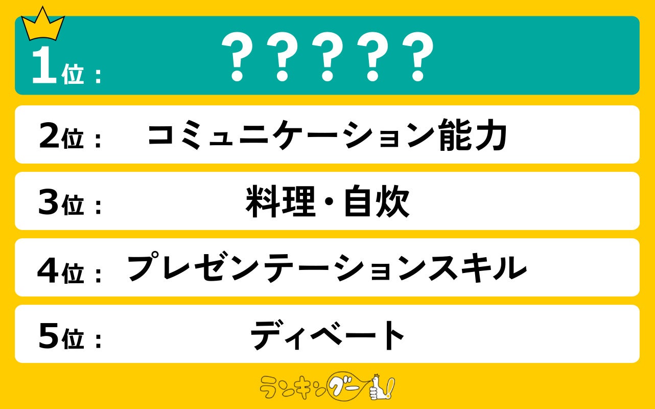 1位は仕事だけでなく海外旅行も楽しくなる、『英語などの外国語』に決定!2位は働くうえで欠かせない能力のひとつ、『コミュニケーション能力』。3位は健康にもつながる、『料理・自炊』。僅差で4位はビジネスで役立つ、『プレゼンテーションスキル』。そして、5位は論理的思考力が身につく、『ディベート』がランクインしました!