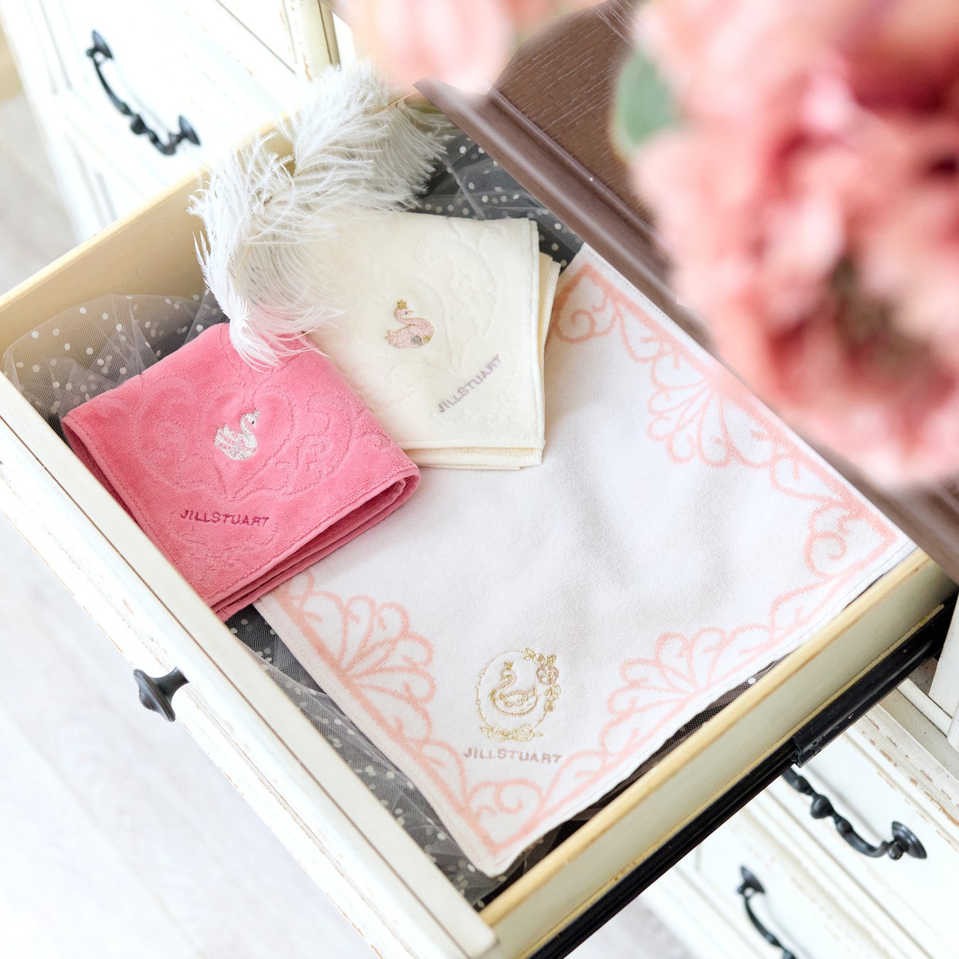コーナーに幸福のシンボル〝スワン〟の刺繍を施しました。