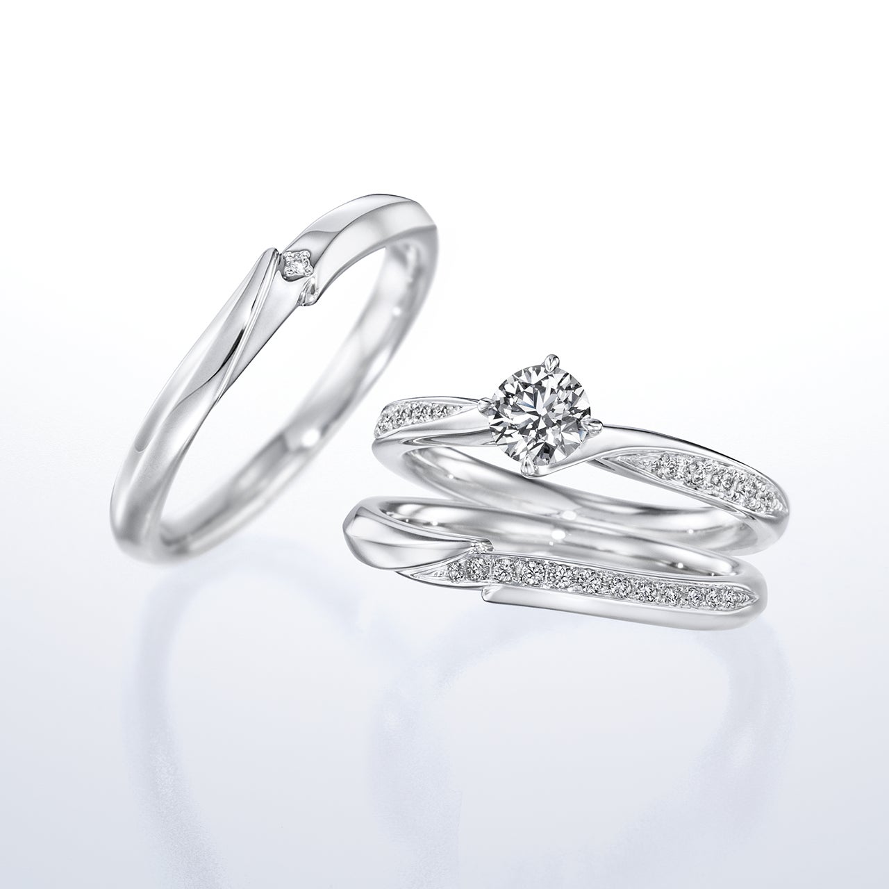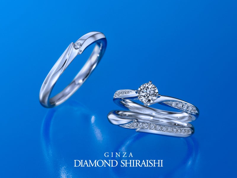 重ねて着けることでマリッジリングのメレダイヤモンドが下から光を集め、センターダイヤモンドをより輝かせます。優しいウェーブをも感じさせる緩やかなストレート、ありそうでないこのデザインはこれまでお客様に寄り添い続けた銀座ダイヤモンドシライシだから実現したセットリングです。