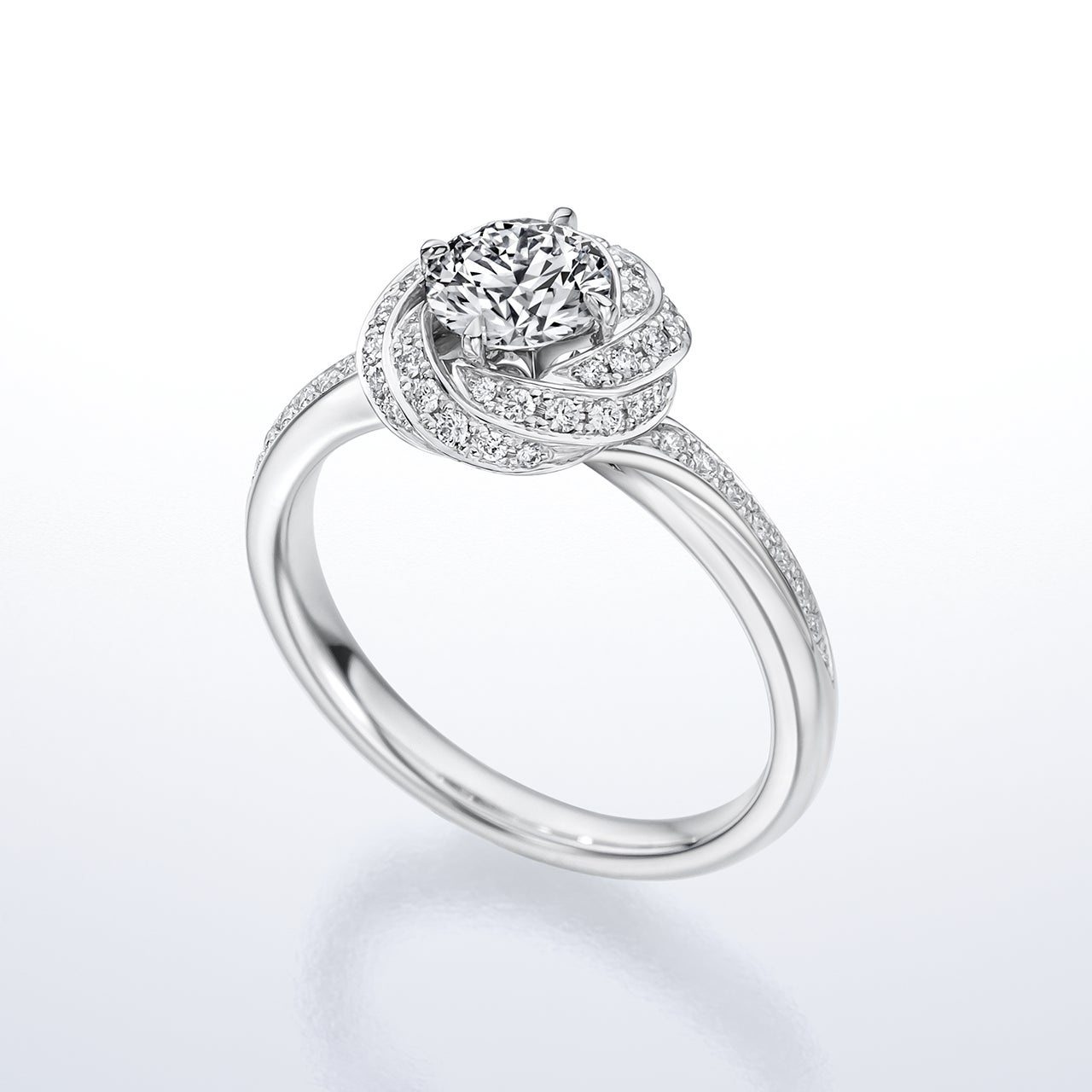 進み続ける時を表現するメレダイヤモンドをサイドからも見えるよう、巻き付くように繊細にセッティングしています。細く絞られた石座はふたりが結ばれる姿をイメージしています。