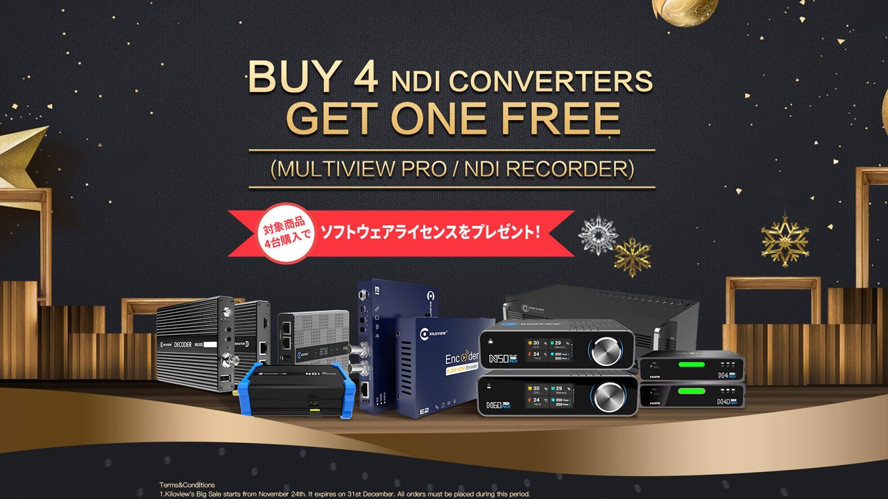 株式会社アスク (本社:東京都千代田区) は、 メディア & エンタープライズ事業部 (アスク・エムイー) 取り扱いの Kiloview 社 NDI シリーズ製品を 4 台ご購入いただいた方に、Kiloview社の Multiview Pro あるいは NDI Recorder のソフトウェアライセンスをプレゼントする「Kiloview BIG SALE」キャンペーンを実施いたします。