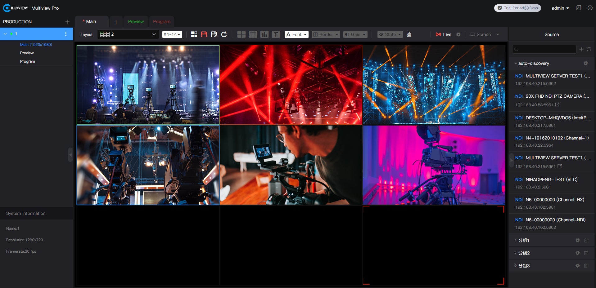 ディスプレイ上に最大 20 チャンネル (ウィンドウ毎に) の NDI ソースが表示でき、PC の HDMI ポートあるいは Ethernet ポートを利用して直接 NDI 出力も行えます。