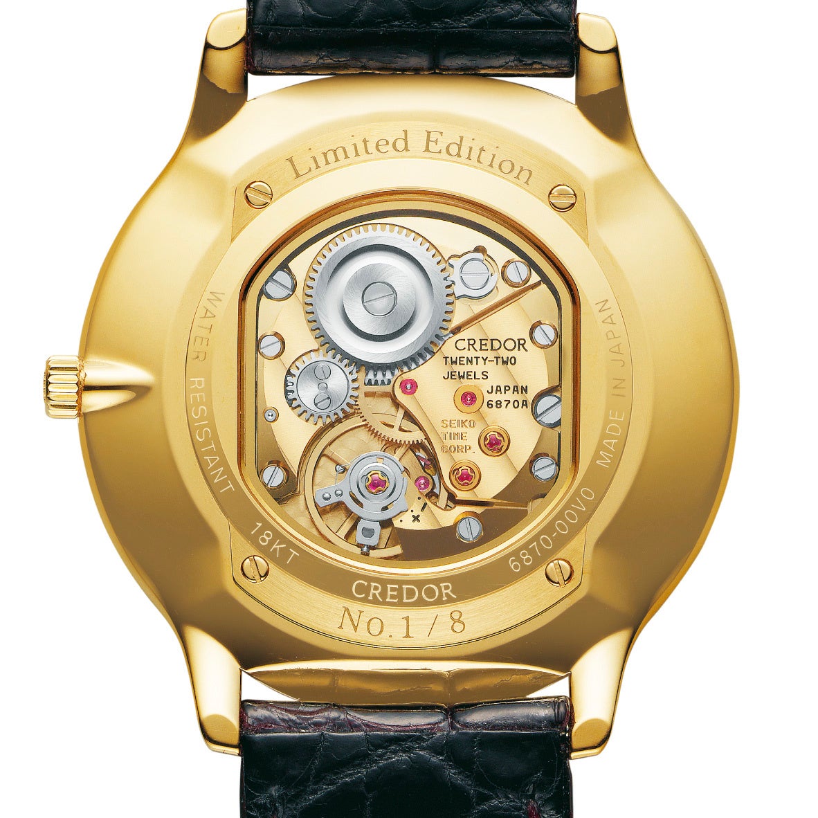 ケースには18Kイエローゴールドを採用。極薄ムーブメントを生かし、サイドはドレスウオッチにふさわしい上品な薄さに仕上げています。裏ぶたはシースルー仕様で、丁寧に仕上げられた手巻ムーブメントをご覧いただけます。また、ストラップはダイヤルのカラーとマッチする、赤みを帯びた黒色のクロコダイルを採用しました。