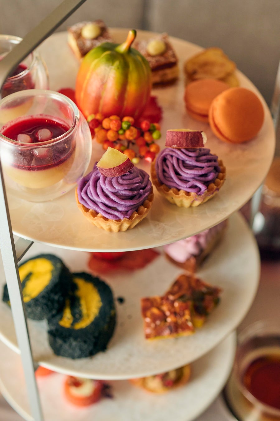 ハロウィンを思わせる秋仕様のミニスイーツ&セイボリーが大集合!鮮やかなパープルが目を引く紫芋のモンブランは、たっぷりの紫芋ペーストの中にクリームチーズが潜んでおり、紫芋の優しい甘さと塩気のあるチーズが相性抜群。その他、竹炭を練り込んだ真っ黒のスポンジに南瓜のクリームを入れた竹炭とカボチャのロールケーキや、旬のいちじくを贅沢に閉じ込めたドライイチジクのケーキ、パイで林檎のムースをサンドしたミルフィーユ風の一品など、盛り沢山で秋スイーツをお届け。ペイストリーにはフォアグラムースをサンドしたエクレアや、南瓜やベーコンなどを使った具沢山なキッシュがラインナップしています。