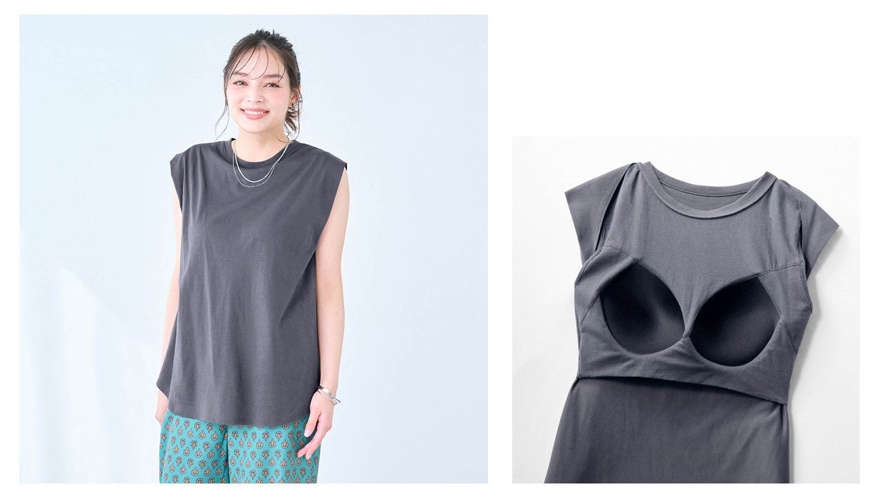 「汗シミーヌ」を着用すると、汗ジミを気にして着替えたり、鏡をチェックしたりする無駄な時間が短縮できます。また、機能面だけでなく、1枚着として映える上品なツヤ感も実現しました。これまで汗ジミが目立ちやすく夏場は敬遠されがちだったグレージュやチャコールなどの色味も展開します。また、同素材でカップ付きも展開しているので、暑さや汗だけでなく下着の透けも気にすることなく、夏場のおしゃれをより自由にお楽しみいただけます。