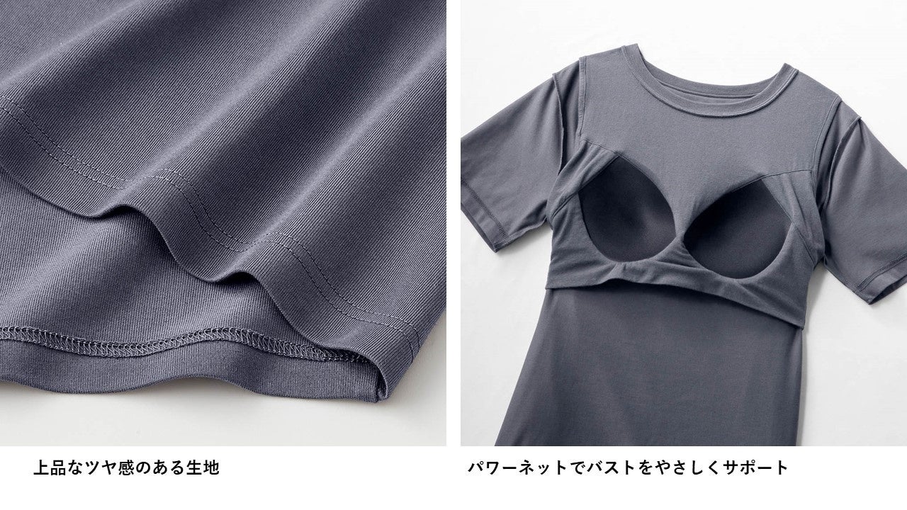 肌着だけでなくブラジャーすら不要なカップ付きタイプは、アンダーゴムの代わりにパワーネットを挟み込むことでバストをやさしくサポートし、長時間着けていても苦しくなりにくい快適な着心地を実現しています。