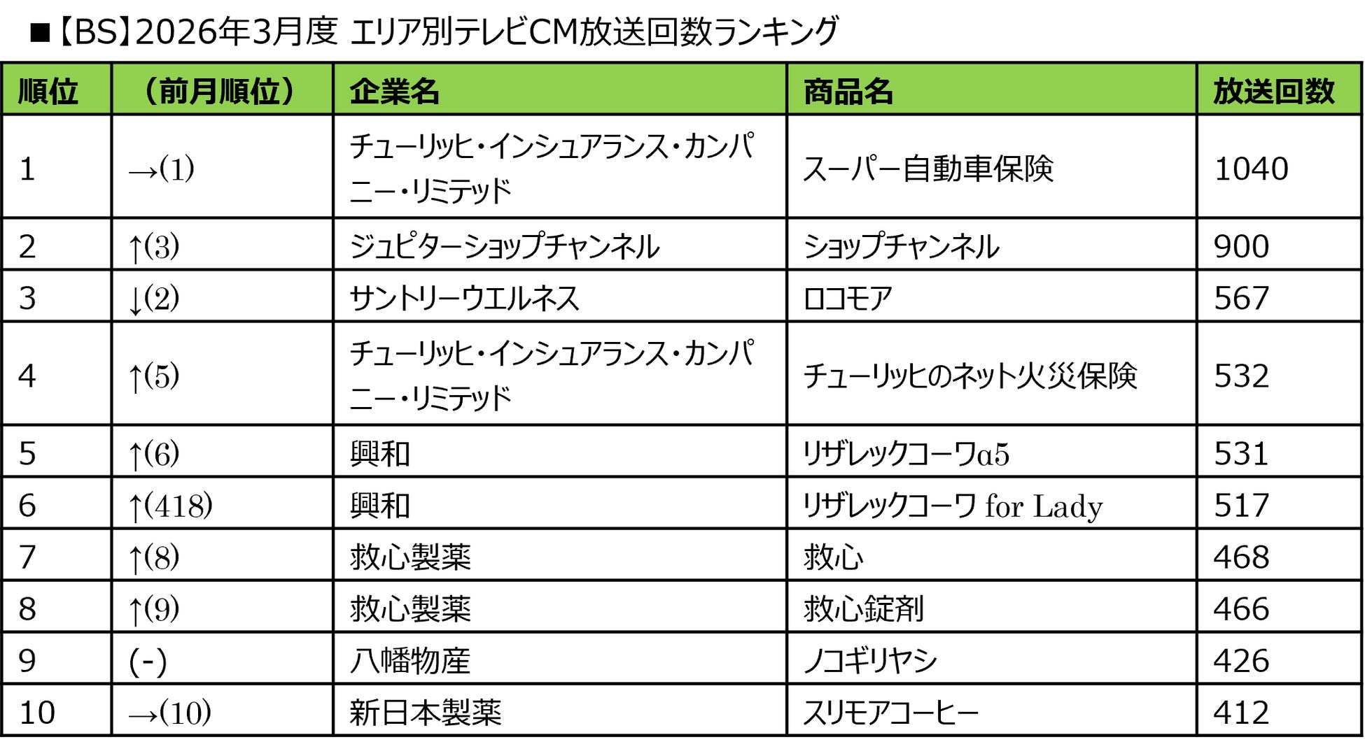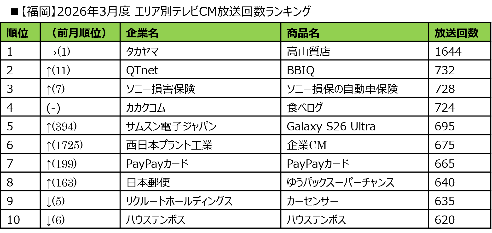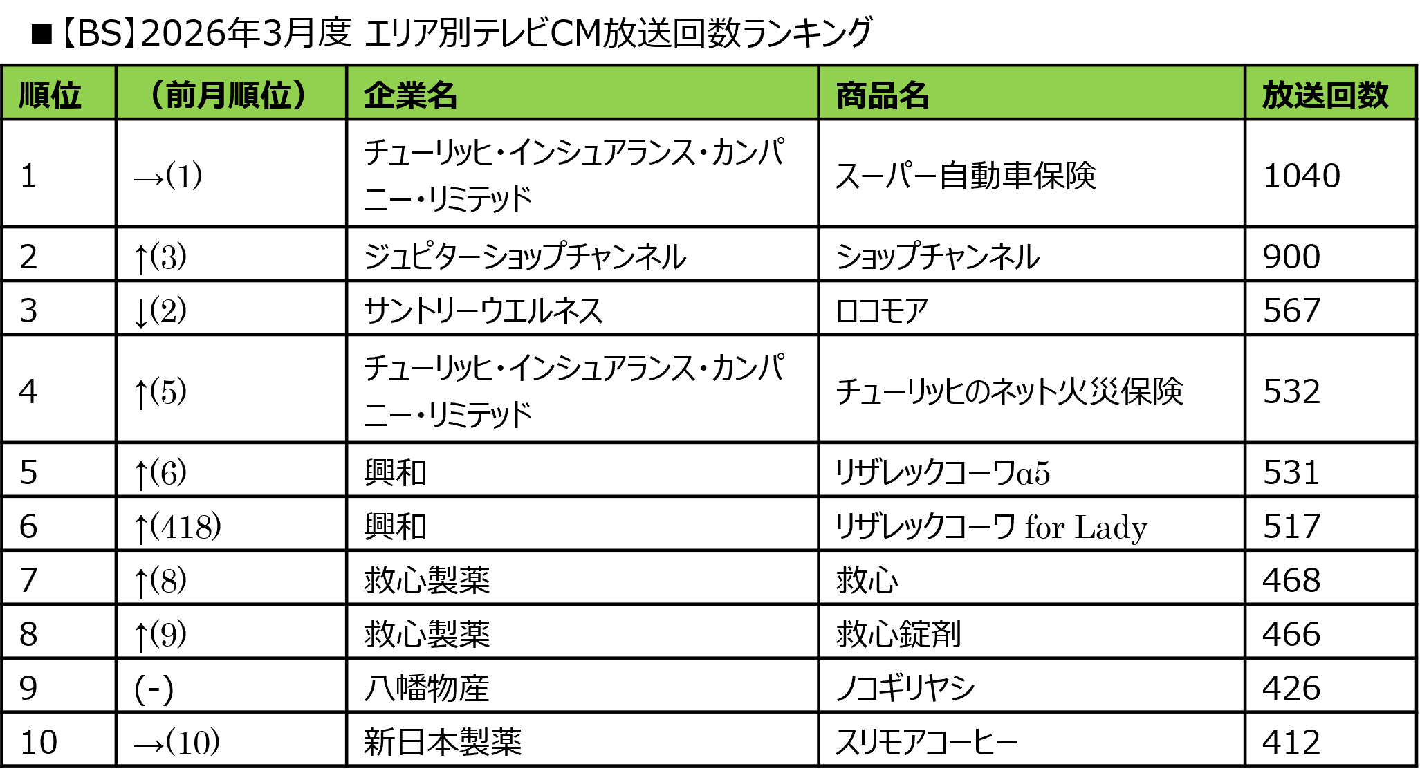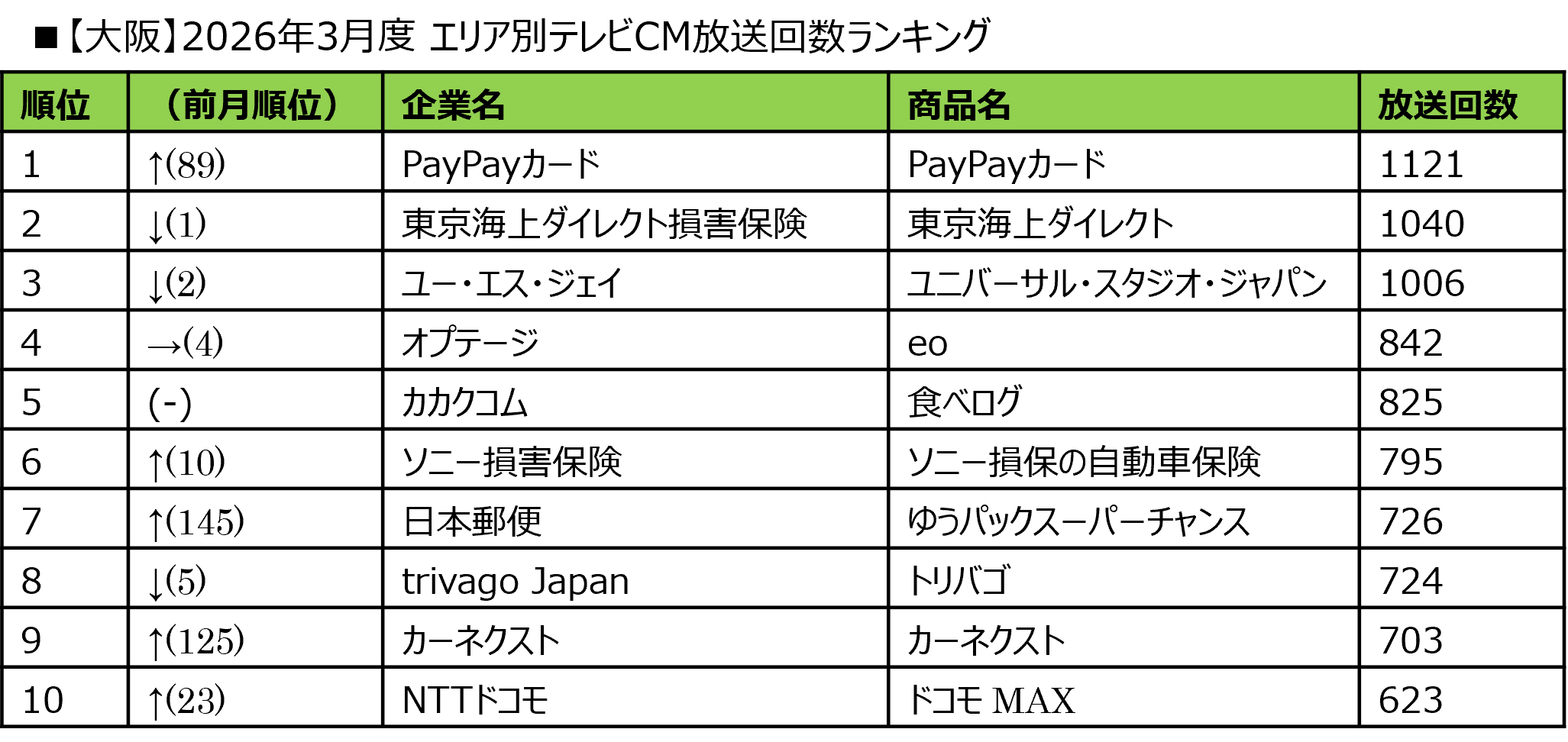 ■2026年3月度 エリア別テレビCM放送回数ランキング
