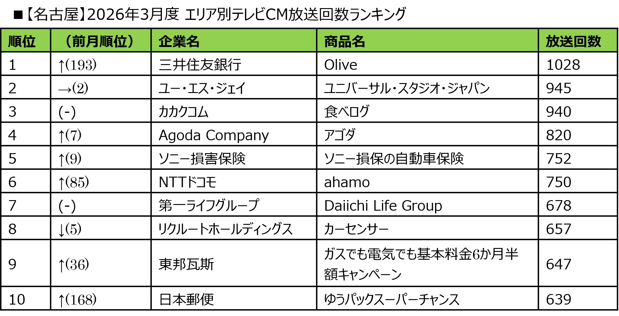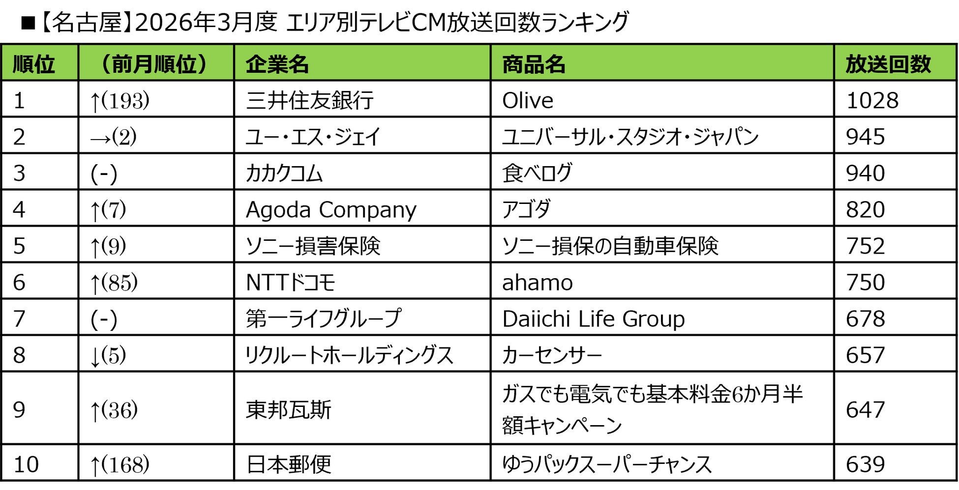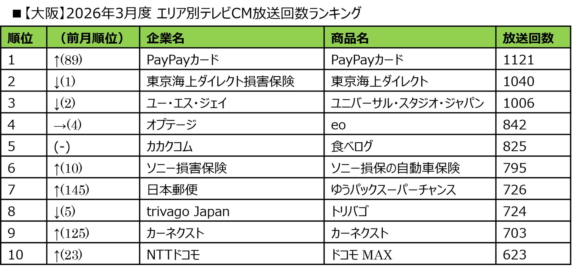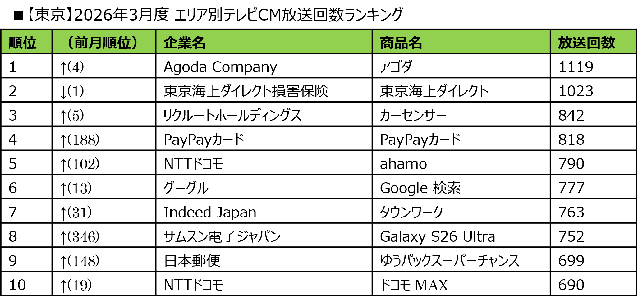 ■2026年3月度 エリア別テレビCM放送回数ランキング