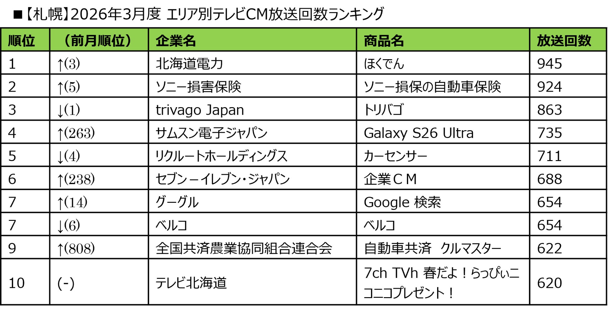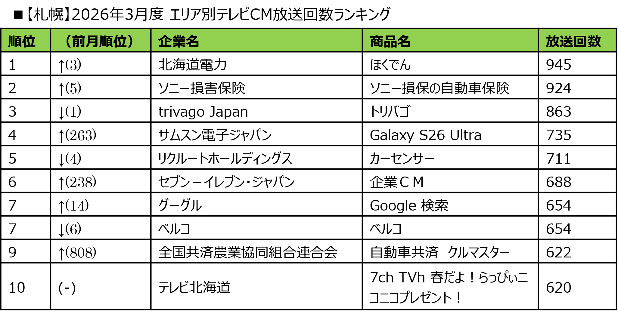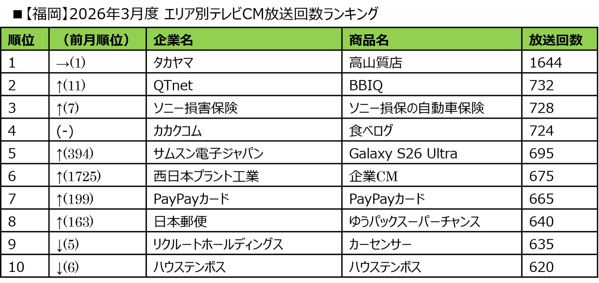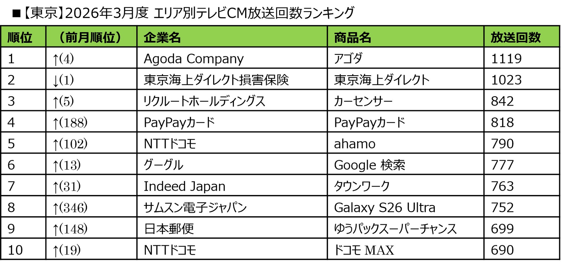このたび、テレビCMメタデータシステムを活用し、2026年3月度の主要5大都市圏※(地上波25局、BS放送6局)で放送されたテレビCMの放送回数を調査・集計結果を発表しました。