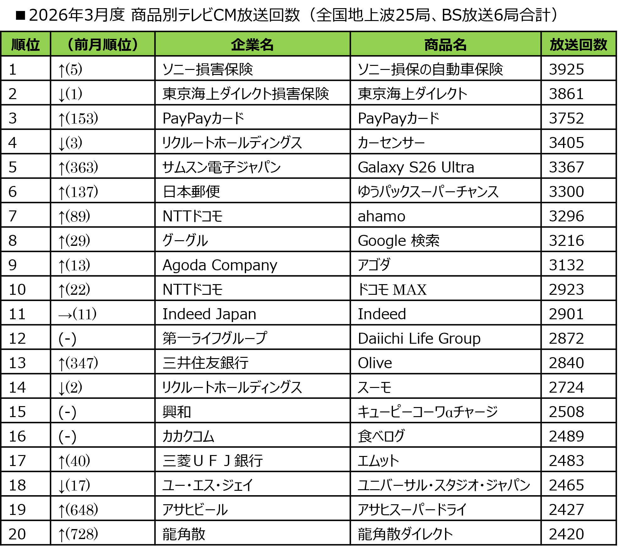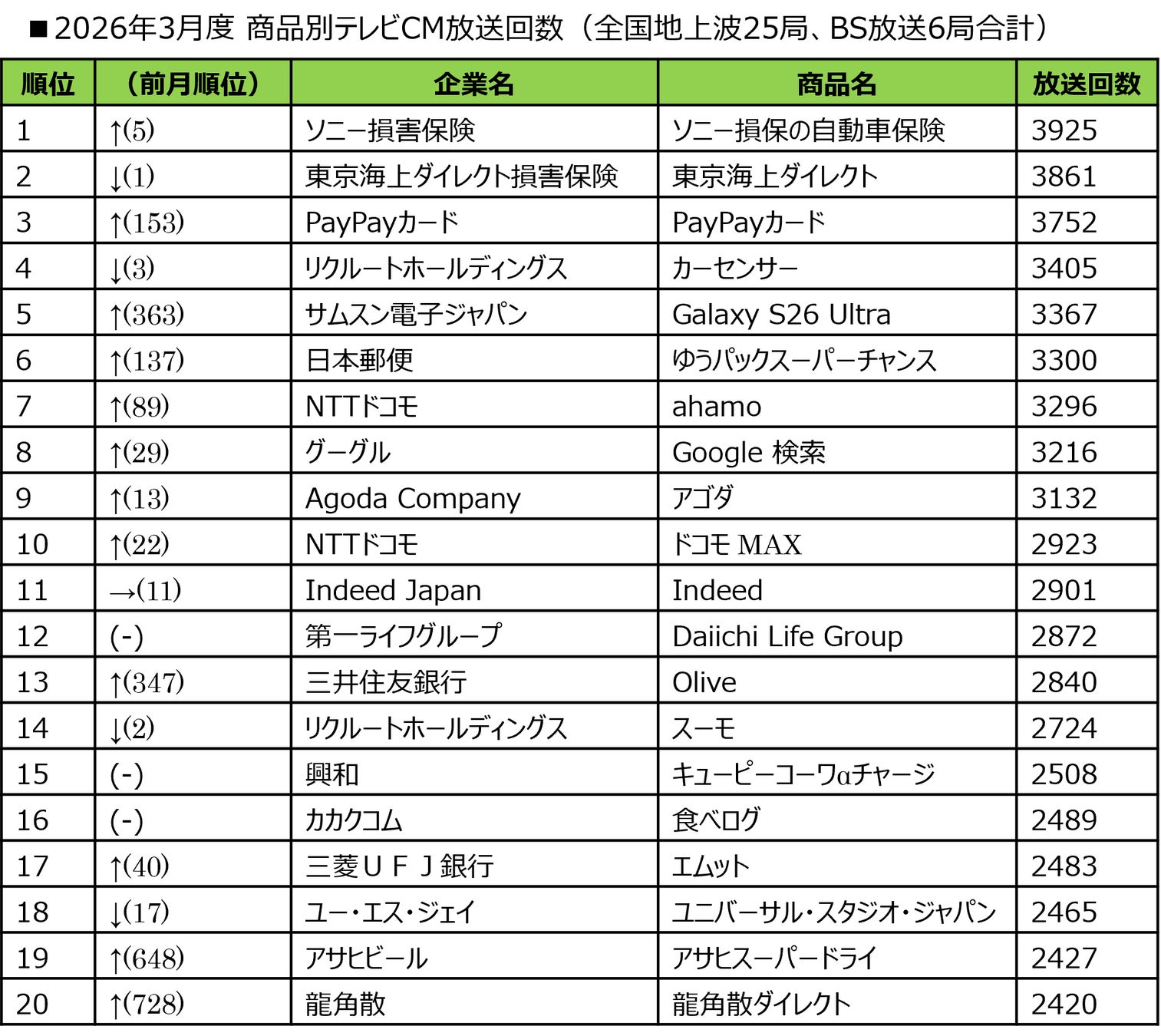 【SMN】2026年3月度テレビCM放送回数ランキング発表 新生活を目前に、自動車保険・キャッシュレス・新型スマホが急上昇
