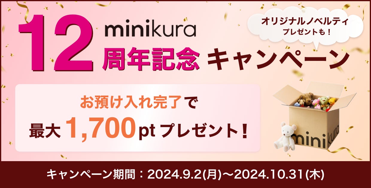 寺田倉庫株式会社(東京都品川区 代表取締役社長:寺田航平)が運営する、宅配型トランクルームサービス「minikura(ミニクラ)」は、2024年9月2日(月)から2024年10月31日(木)までの期間、サービス開始12周年を記念するキャンペーンを実施します。