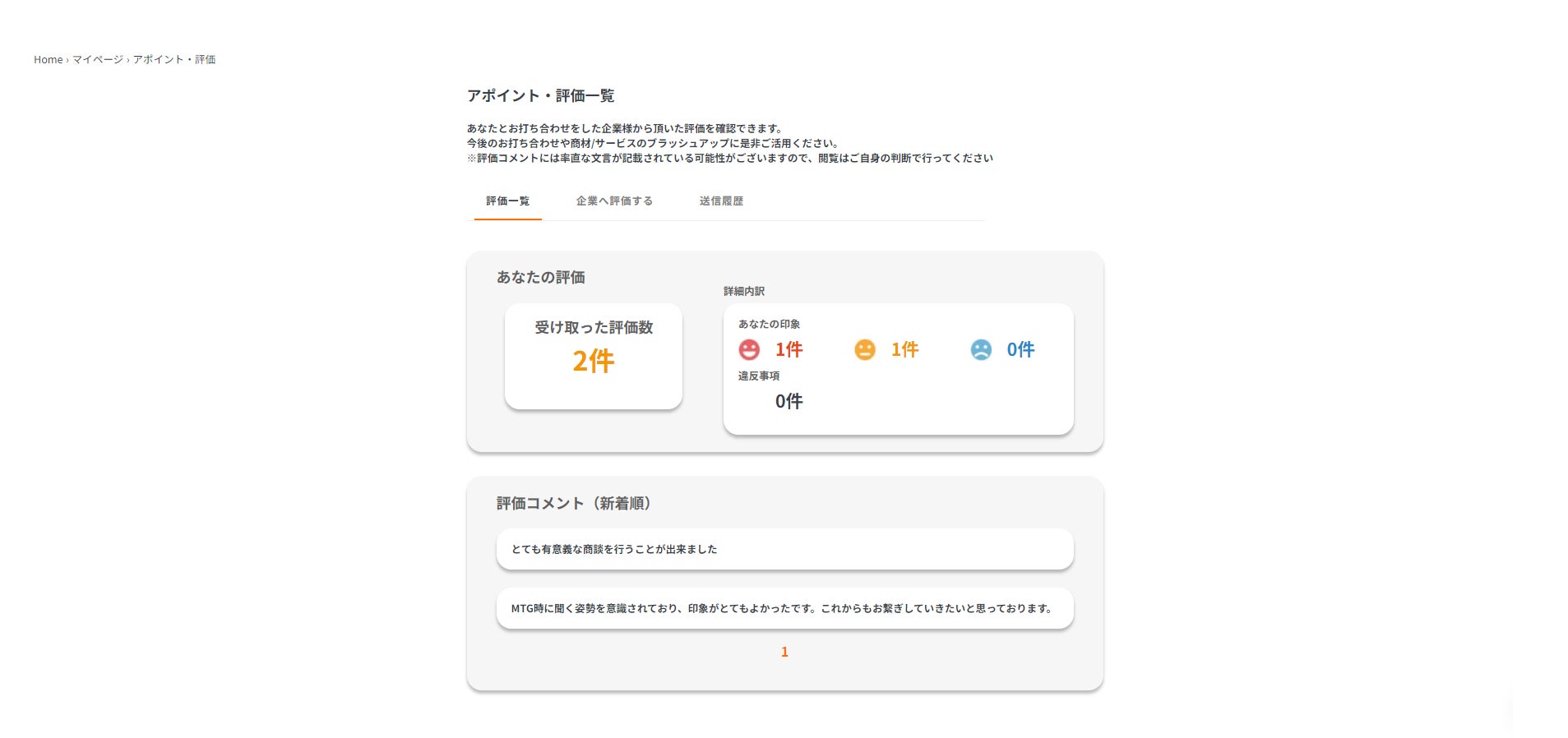 新たに公開したフィードバック機能を使用すると、ステータスを「打ち合わせした」に変更後、「相手の印象」「違反行為の有無」「コメント」を記入できるページが表示されます。