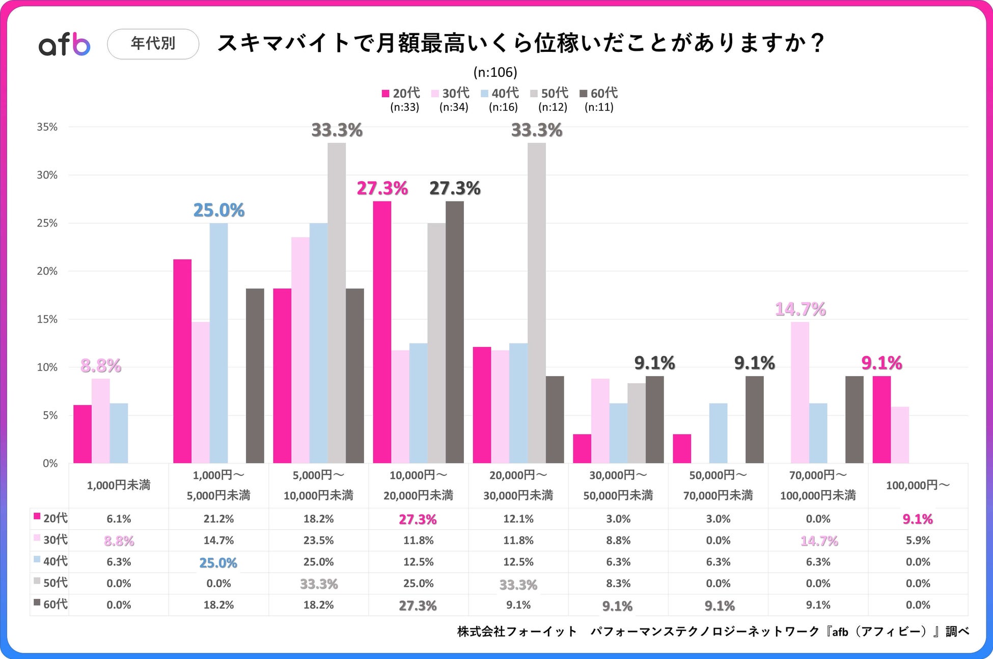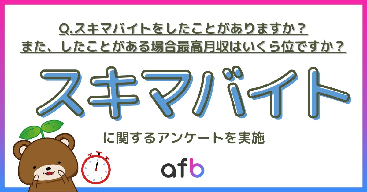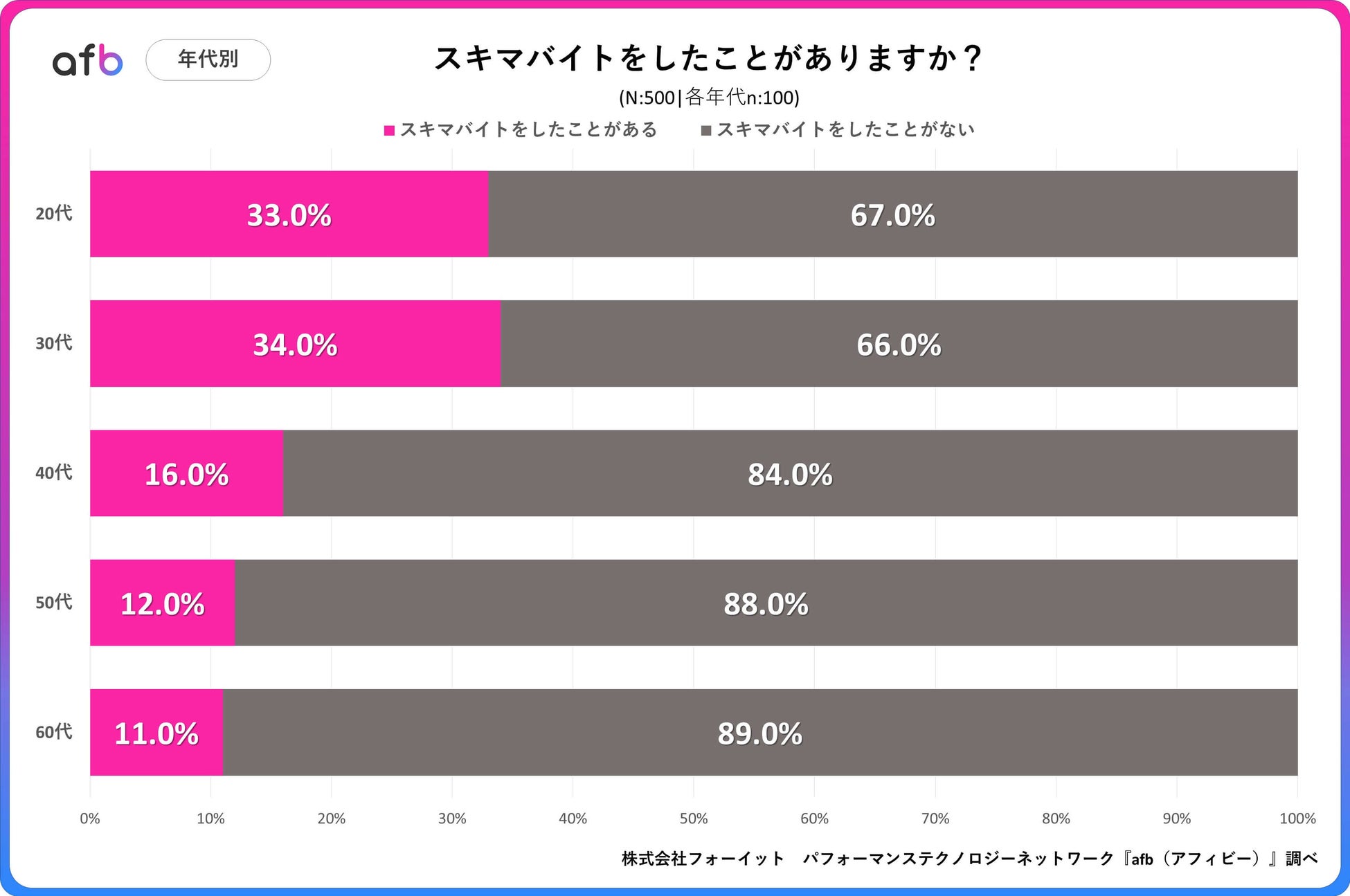 パフォーマンステクノロジーネットワーク「afb(アフィビー)」< https://www.afi-b.com/ >の開発運用をおこなう株式会社フォーイットは、全国の20歳~60歳までの男女500人を対象にスキマ時間に関するアンケートを実施し、年代別等の特徴についてまとめました。