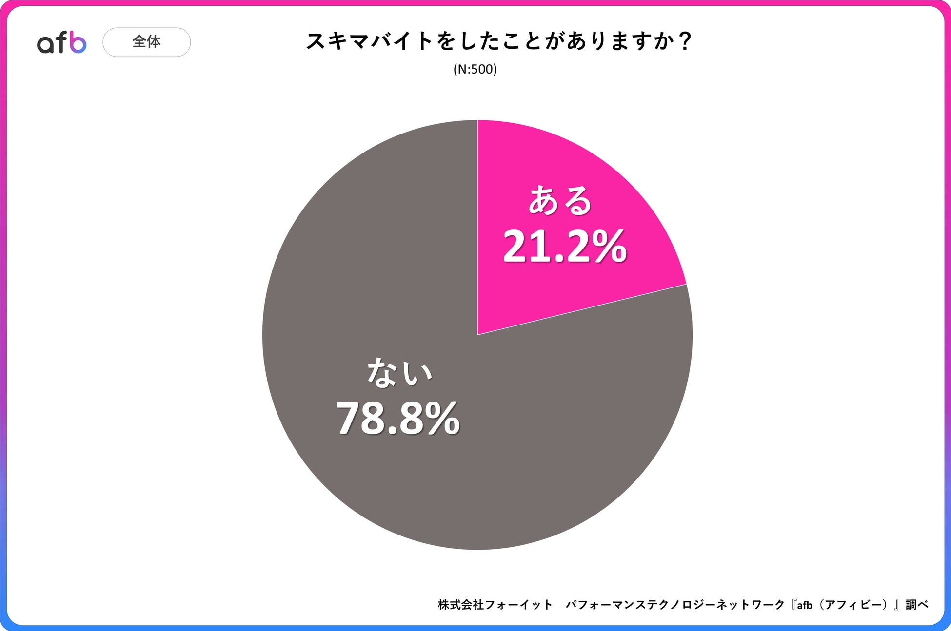 全国の20代〜60代の男女を対象に、「スキマバイトをしたことがありますか」というアンケートを実施したところ、「スキマバイトをしたことがある」と回答した方は全体の21.2%という結果になりました。