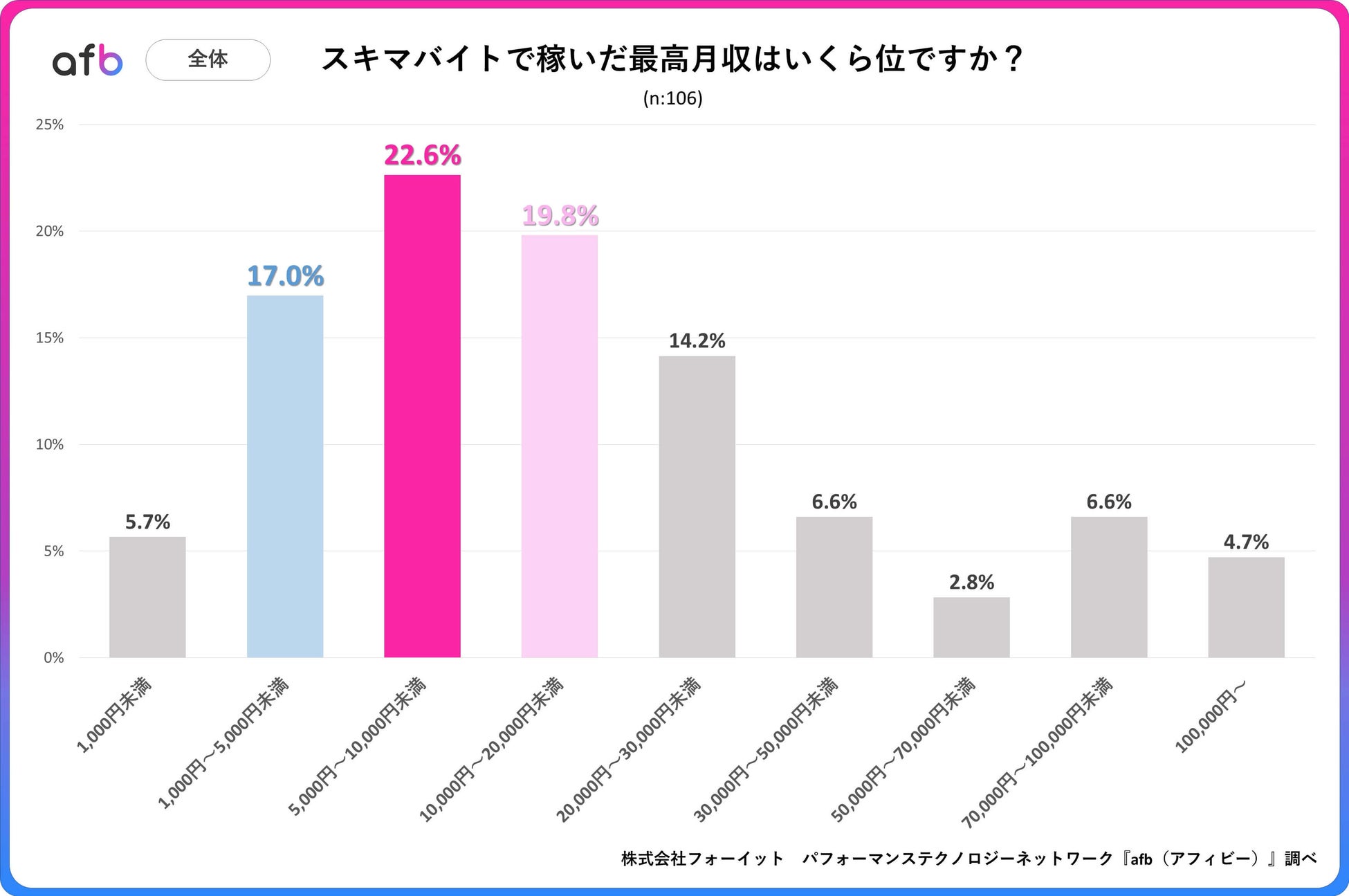 続いて、「スキマバイトをしたことがある」と回答した方を対象に、スキマバイトで稼いだ最高月収を聞いたところ、最も多かった回答は「5,000円~10,000円未満」で22.6%、次いで「10,000円~20,000円未満」で19.8%、「1,000円~5,000円未満」で17.0%と続く結果となりました。
