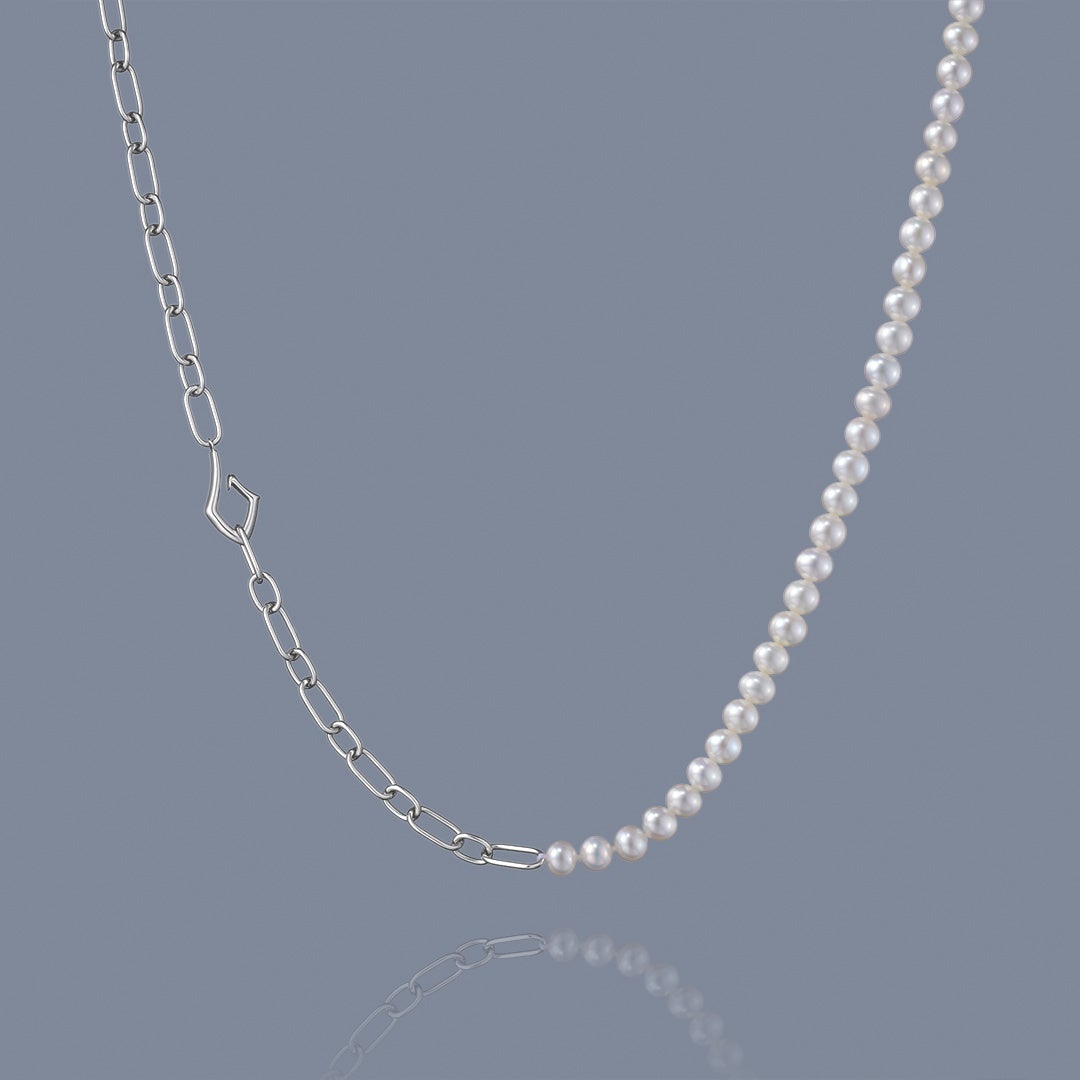 深海の海にゆらめく泡をパールで表現したシリーズが登場。シルバーチェーンとパールのアシンメトリーなデザインのネックレスやブレスレットは、夏のシンプルな装いに主役級の存在感をプラスします。釣り針に着想を得たフックがポイントのネックレスは、フックを外してデザインチェーンとしてシンプルにも身に纏える2WAYデザインに。シルバーの地金の間にパールを添えたイヤーカフは、地金のラインの断面を丸と四角であえてアシンメトリーに仕立てたシェアジュエリーにもおすすめなアイテムです。