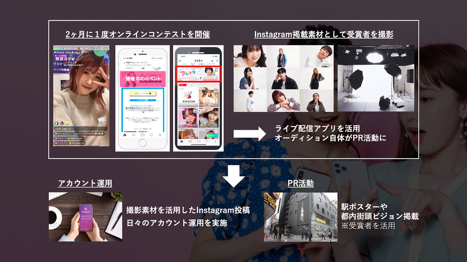 オンラインコンテストにて上位に選ばれた受賞者の撮影会を実施し、投稿コンテンツとして素材を制作。制作した素材は、PR活動の一環として駅ポスターや都内街頭ビジョンなどに掲載いたします。