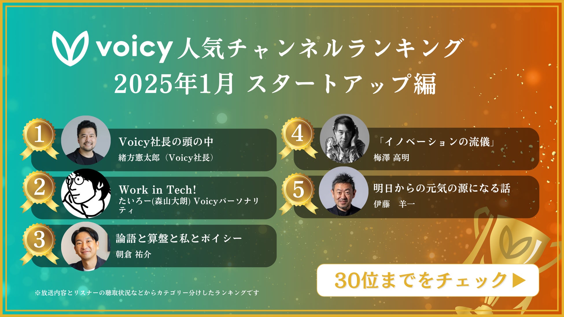 今後、「スタートアップ」カテゴリに関連した発信をされているチャンネルのうち、最も聞かれているTOP30を毎月発表していきます。
