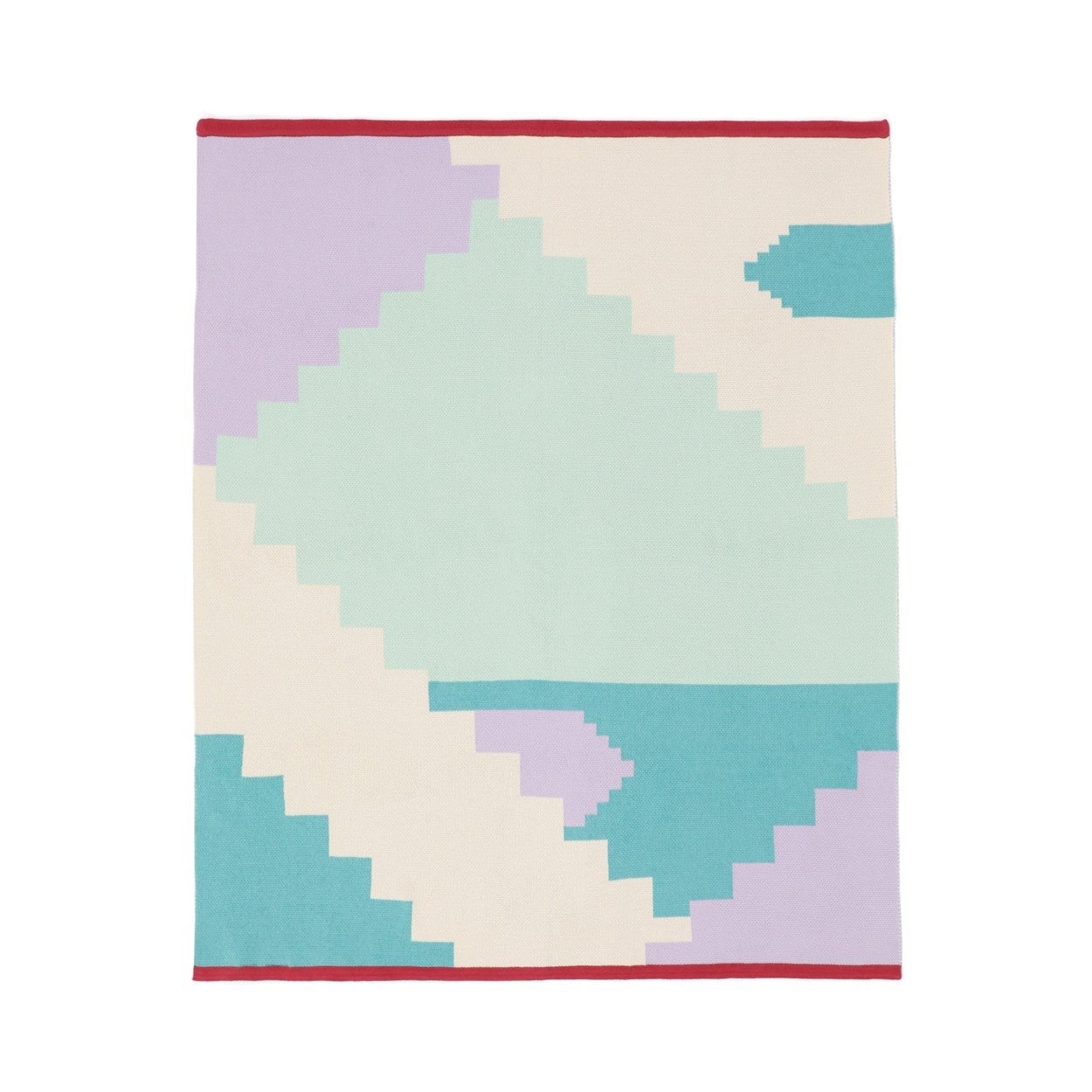 寒い日にぴったりのあたたかいニット素材を使用し、編み方の特徴を生かして作品の階段シーンをモチーフにしたスローです。パイピングに配色した濃いピンクの色は隊列をイメージした遊び心もデザインされています。高級感のあるニット素材でインテリアにも馴染みやすい幾何学柄に仕上げているのでデイリーユースにぴったりです。鑑賞中に使うのに嬉しい大判サイズです。