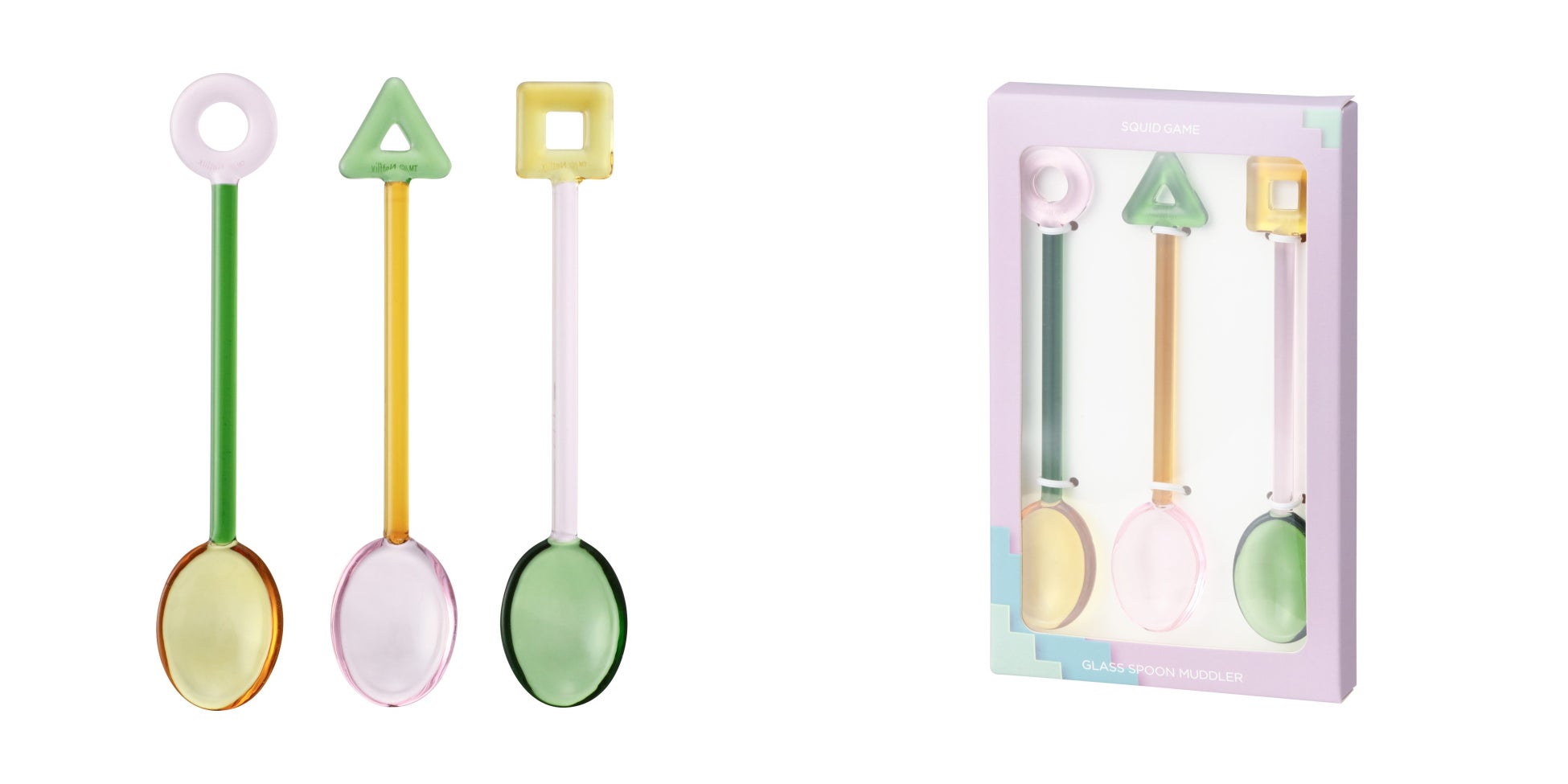 作品に登場する象徴的なアイコンの〇△□の図形を持ち手にデザインしたスプーンマドラーセットです。耐熱ガラスを使用しているのであたたかいドリンクにもお使いいただけます。マグとコーディネートするのがおすすめです。
