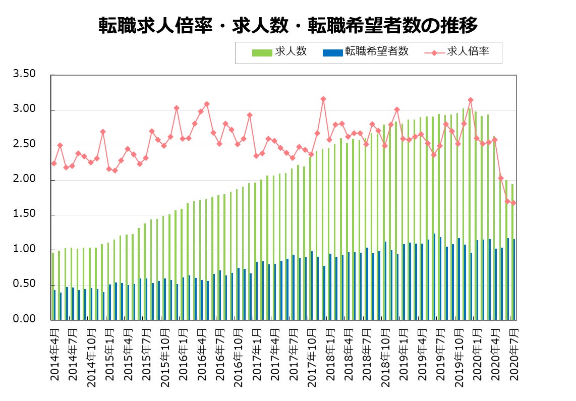 2020年7月の転職求人倍率は、前月比-0.02ポイントの1.68倍となりました。求人数は前月比97.2%、前年同月比66.0%となりました。転職希望者数は前月比98.5%、前年同月比97.7%でした。