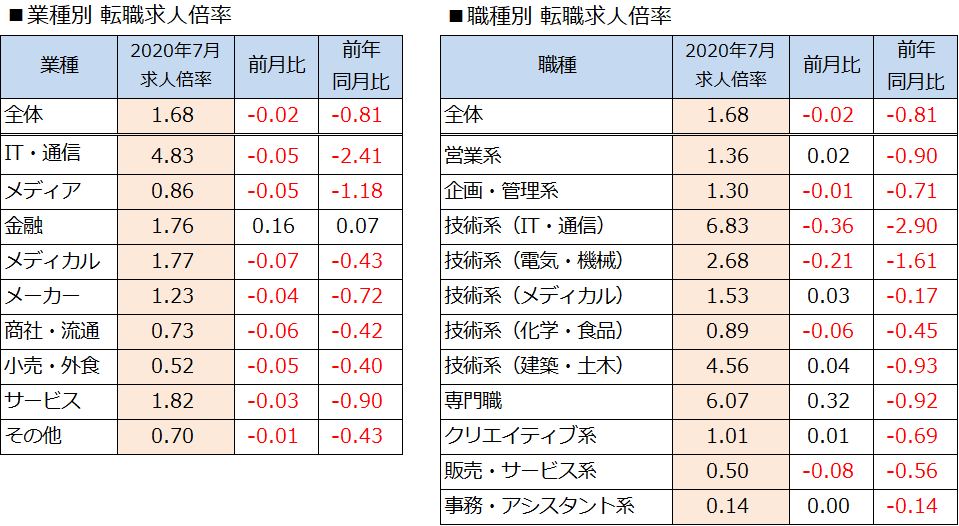 7月中旬から東京・大阪・愛知などの大都市圏を中心に新型コロナウイルス感染症が拡大したことを背景に、採用活動を再度縮小・一時停止する企業が増え、求人数は微減となりました。転職希望者数も微減となりましたが、求人数の減少幅が転職希望者数のそれを上回ったため、求人倍率は低下しました。