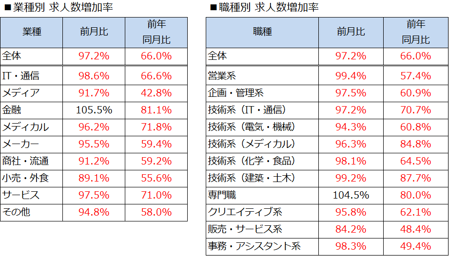業種別では、「その他」を除く8業種のうち「金融」(前月比105.5%)のみ求人数が増加しました。職種別では、11職種のうち「専門職」(前月比104.5%)のみ求人数が増加しました。