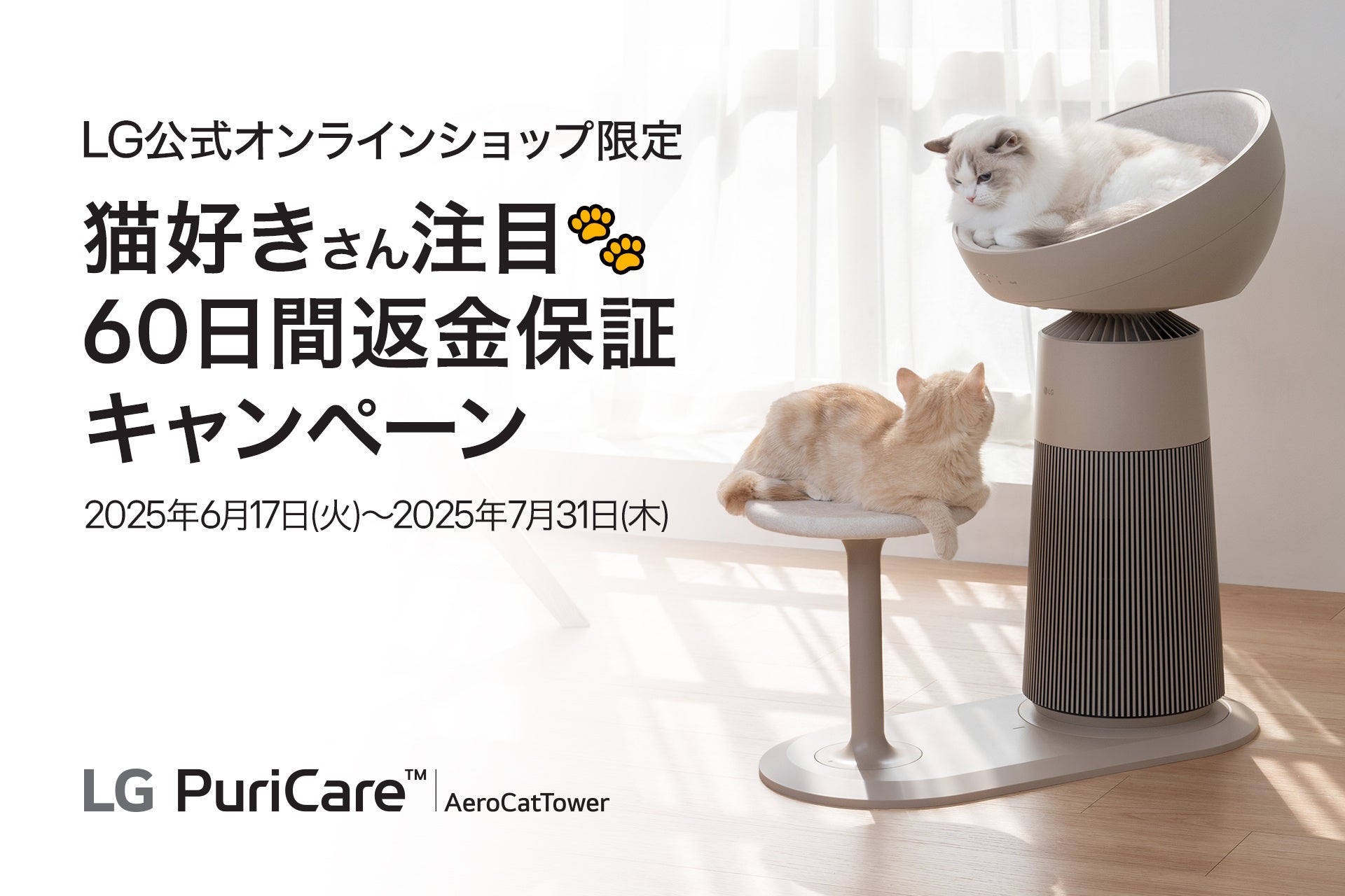 LGエレクトロニクス・ジャパン株式会社(代表取締役:孫 成周(ソン・ソンジュウ)、本社:東京都中央区)は、本日2025年6月17日(火)から7月31日(木)までの期間中、LG公式オンラインショップで猫の健康管理とキャットタワーを兼ねた愛猫家・愛猫のための新発想マルチ機能空気清浄機「LG PuriCare™ AeroCatTower」(読み:エルジー・プリケア・エアロキャットタワー)をご購入いただいたお客様を対象に、先着50台限定で60日間返品保証キャンペーンを実施いたします。