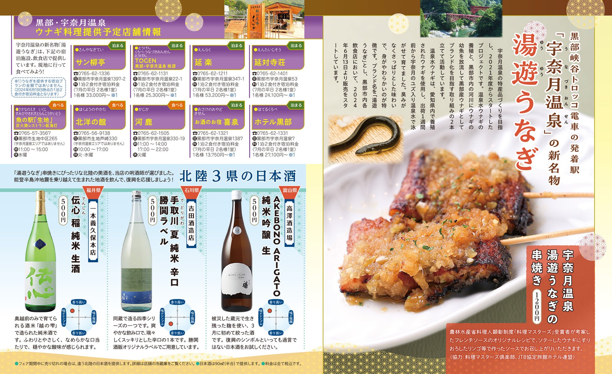 また、JTBが2024年4月から9月まで開催している「日本の旬 北陸」キャンペーンの実施に合わせ、北陸3県の日本酒を3種類提供するフェアも併催し、うなぎに合うお勧めの日本酒を提供します。能登半島沖地震を乗り越えて生まれた富山の地酒もご用意し、復興応援します。