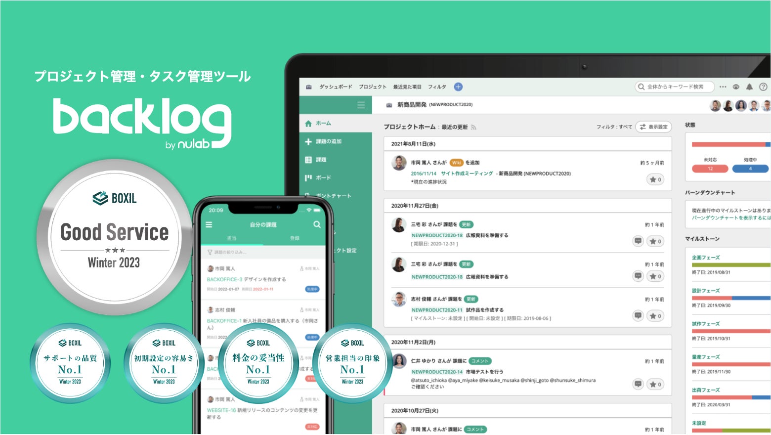 ヌーラボが提供する「Backlog」はプロジェクト管理・工数管理部門で、「Good Service」「営業担当の印象No.1」「サポートの品質No.1」「初期設定の容易さNo.1」「料金の妥当性No.1」に選ばれました。