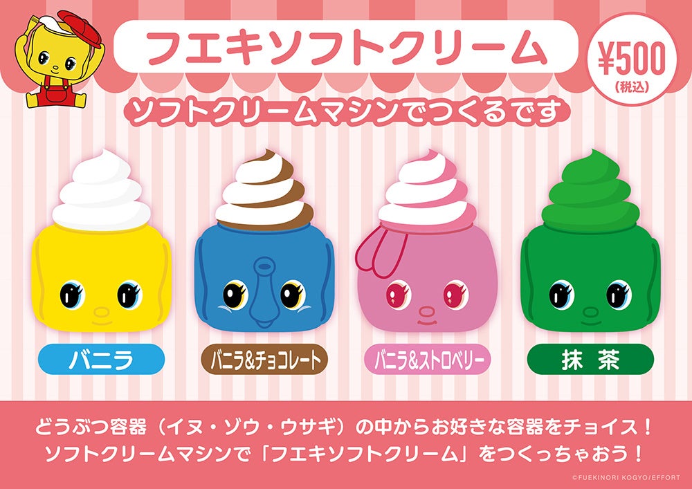 ディスプレイされたどうぶつ容器(イヌ・ゾウ・ウサギ)の中からお好きな容器をチョイス!ソフトクリームマシンでフエキソフトクリームをつくっちゃおう! 味はバニラ、バニラ&チョコ、バニラ&ストロベリー、抹茶の4種類からお選びいただけます。