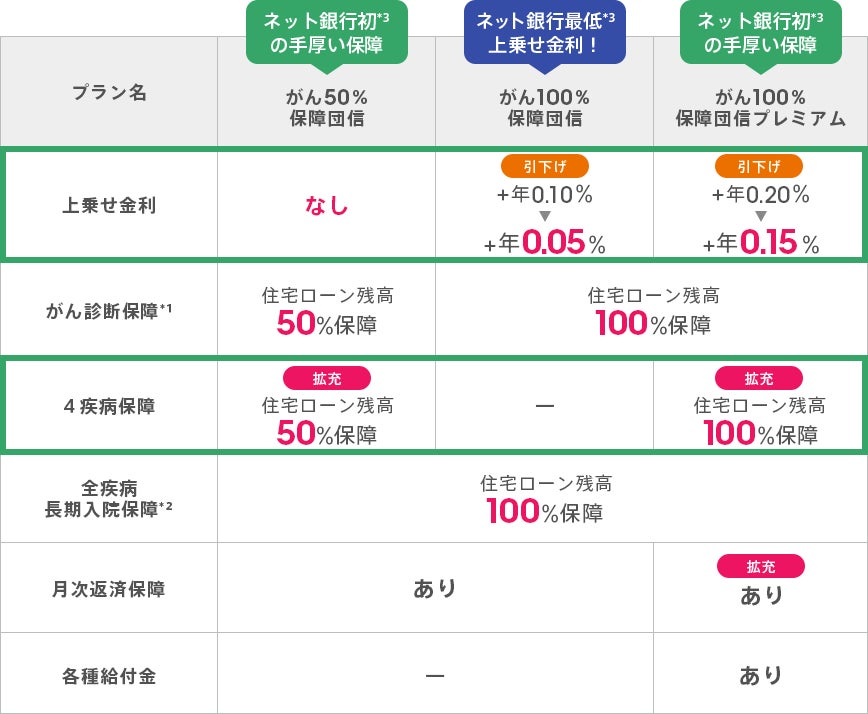 また、<がん100%保障団信プレミアム(旧:11疾病保障団信)>は「4疾病保障」などが追加され保障内容が手厚くなるだけでなく、これまで以上にご利用いただきやすいよう、上乗せ金利を「+年0.20%」から「+年0.15%」へ引下げます。