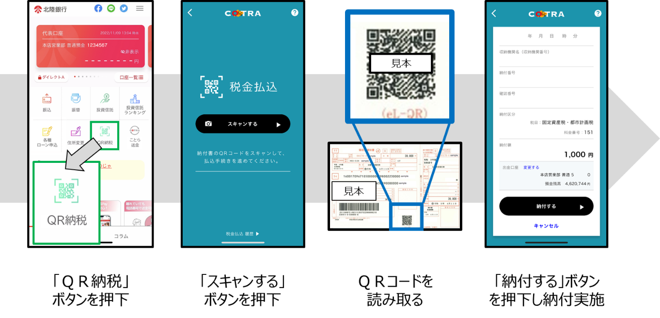 また、「ことら税金払込サービス」は、「地方税統一QRコード」※2(2023年4月発行開始)が印字されている地方税納付書のお支払いができるサービスです。銀行窓口に来店することなく、休日・夜間など時間を問わずお手持ちのスマートフォンから納付することができます。※3
