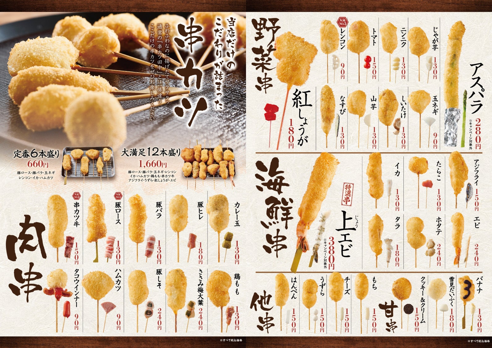 ・15時以降130円(税込)~240円(税込)の串カツを全て100円(税込110円)で提供