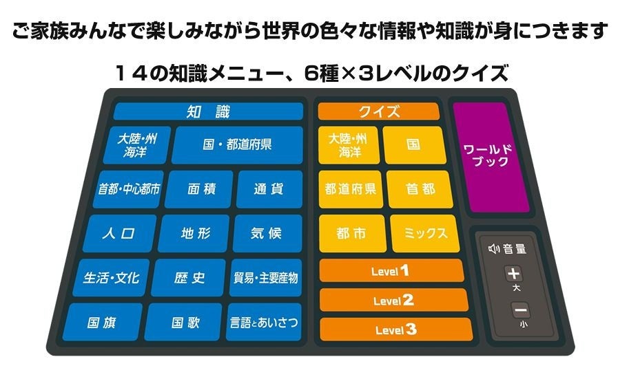「①大陸・州・海洋」「②国・都道府県」「③首都・中心都市」「④面積」「⑤通貨」「⑥人口」「⑦地形」「⑧気候」「⑨生活・文化」「⑩歴史」「⑪貿易・主要産物」「⑫国旗」「⑬国家」「⑭言語とあいさつ」に至るまで、世界の様々な情報を約5,000の音声コンテンツとして収録しておりますので、知りたい情報を知りたいときに、ペンでタッチするだけで楽しみながら学習することができます。