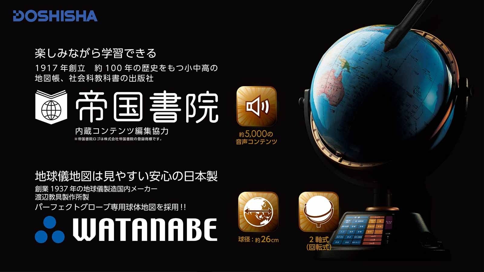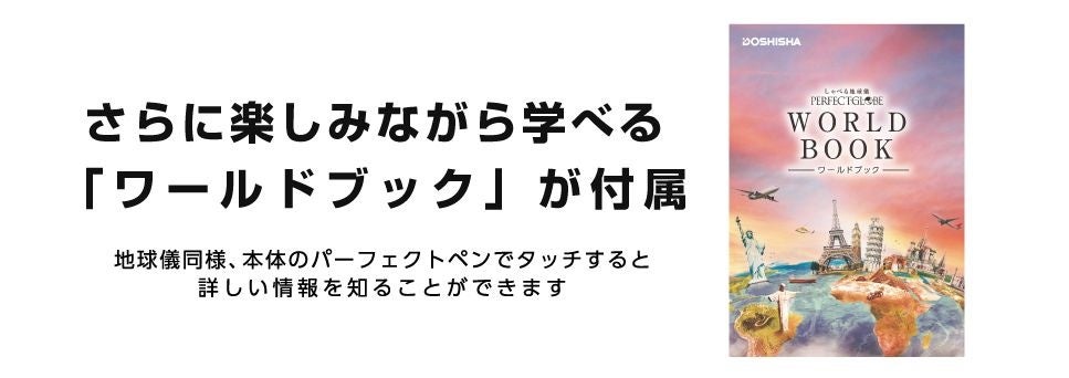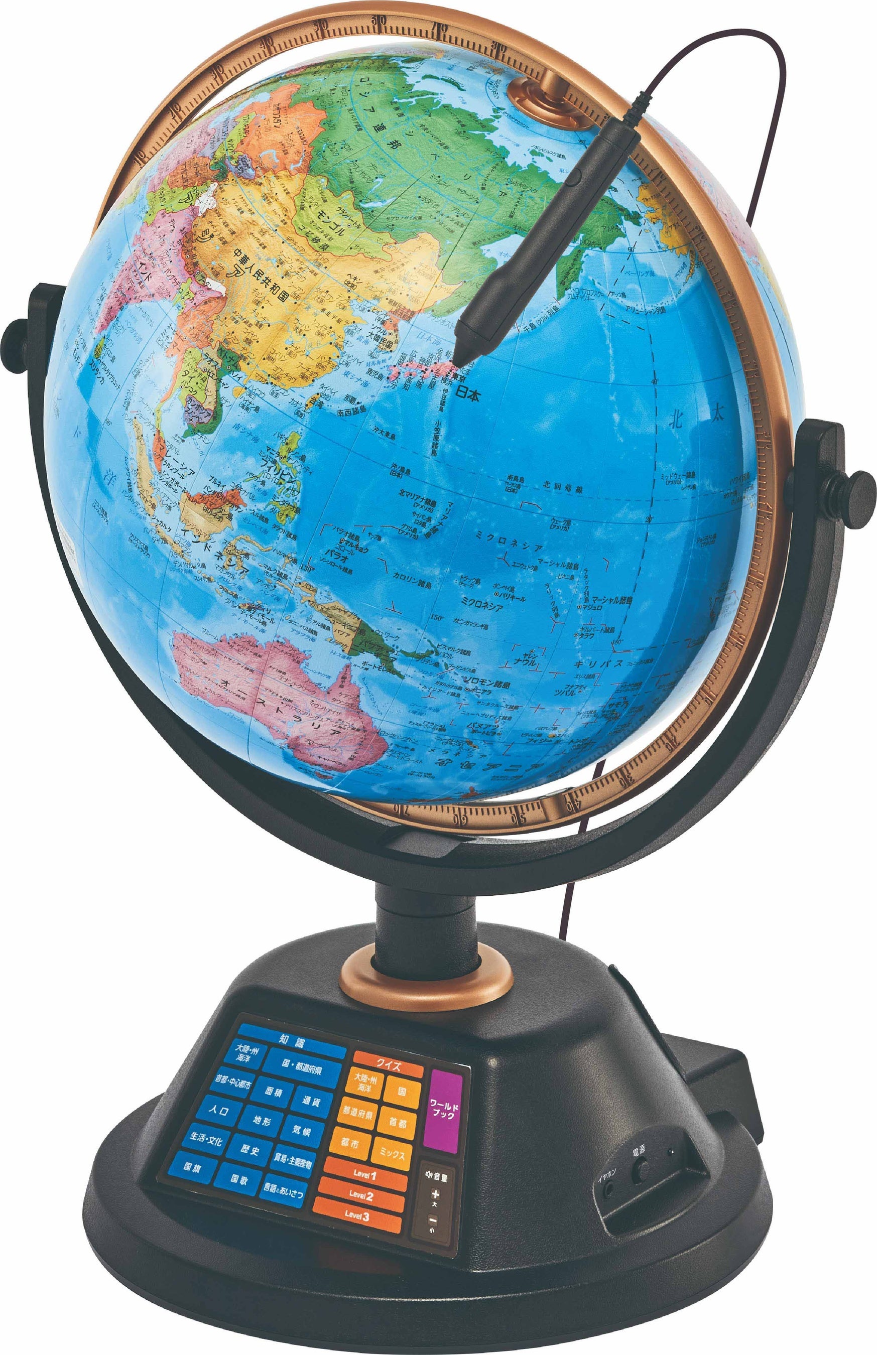 「しゃべる地球儀PERFECT GLOBE X (パーフェクトグローブ テン)」はテーマを選んで国をペンでタッチすると、その国の情報を音声で教えてくれる、全く新しいしゃべる地球儀です。眺めるだけでは知りえなかった情報を音声で提供することで、従来の地球儀とは全く異なる体験をお届けします。信頼のMADE IN JAPANです。