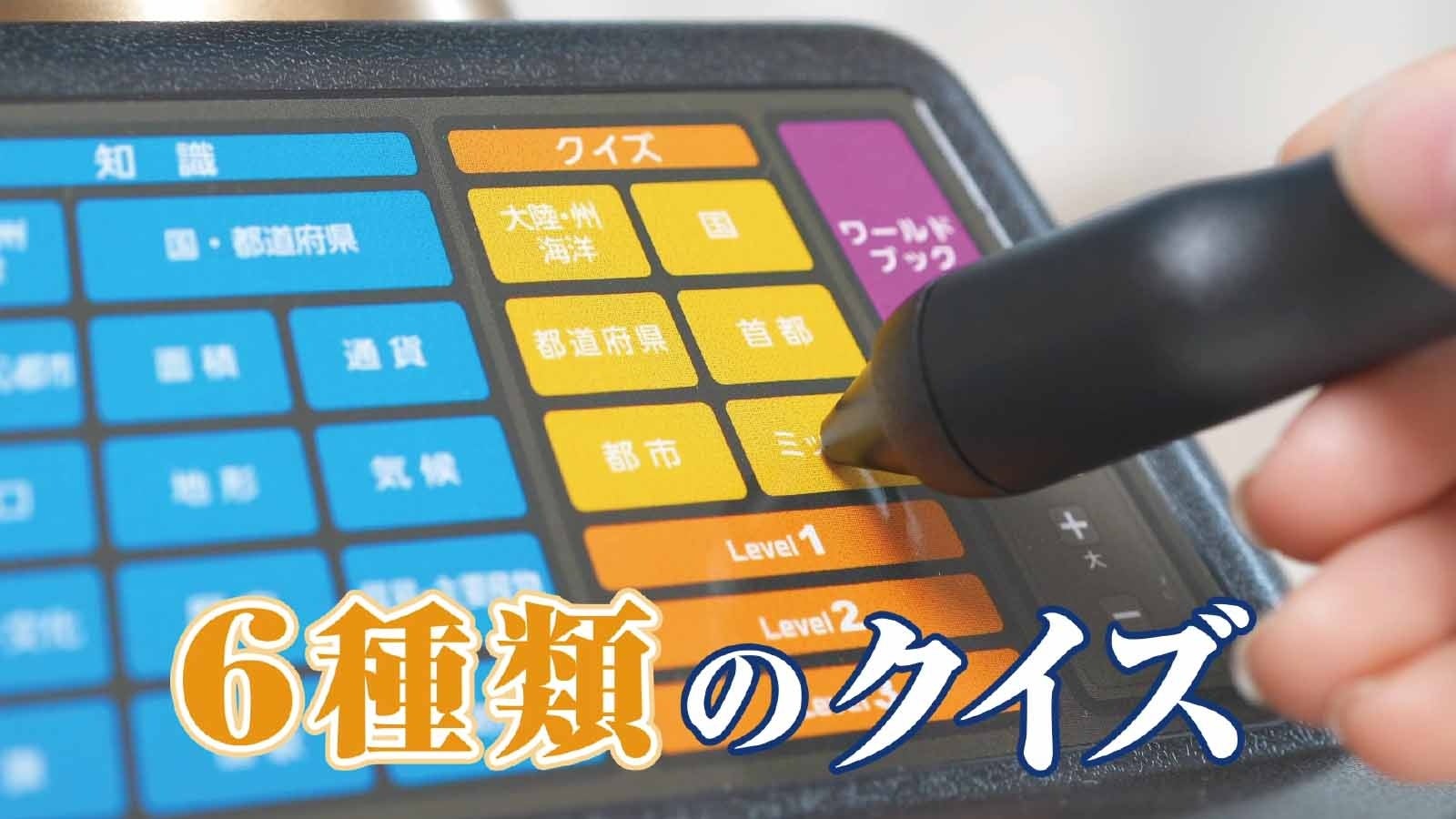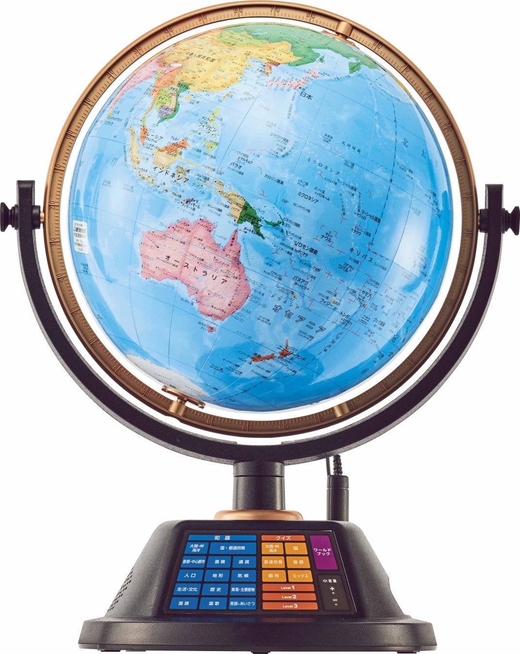 難易度が選べる楽しい6種類のクイズ機能を搭載しており、レベルも1~3で選ぶことができますので、お子さまから大人まで、ご家族みんなで一緒に楽しめる地球儀です。