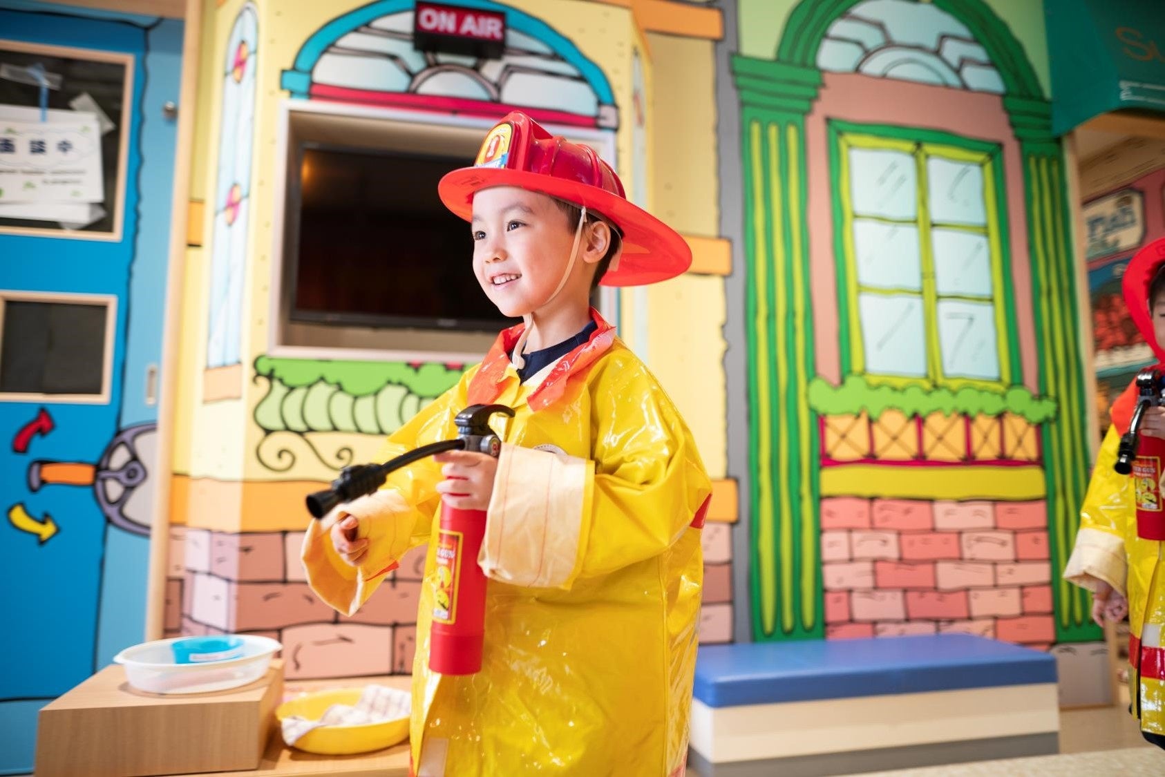 全てのKDIの園舎には、さまざまな職業を体験するラーニングステーションを設けており、週1回の職業体験プログラムを行っています。消防士体験は人気が高いプログラムのひとつで、消防士や消防車に乗ることは園児たちの憧れです。KDIでは今後も、消防署による防災教室など各地域の自治体と連携しながら幼児期から防災や・安全に対する意識を高める取り組みを継続的に行ってまいります。