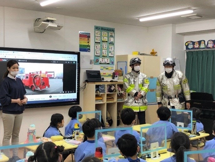 この防災教室は、子どもたちに消防を身近に感じ、防災意識を高めてもらうために行っています。今回は、消防についての紙芝居をライブ配信した後、同署の消防士6名がKDIセンター南の全12クラスを順番に訪れ、消防士への質問コーナーなど消防のミニレッスンを行いました。園児たちは消防士に「火の中に飛び込むのは怖くないの!?」「なぜゴーグルをつけるの?」「ハシゴの長さは?」など、さまざまな質問をし、防災への関心を高めていました。