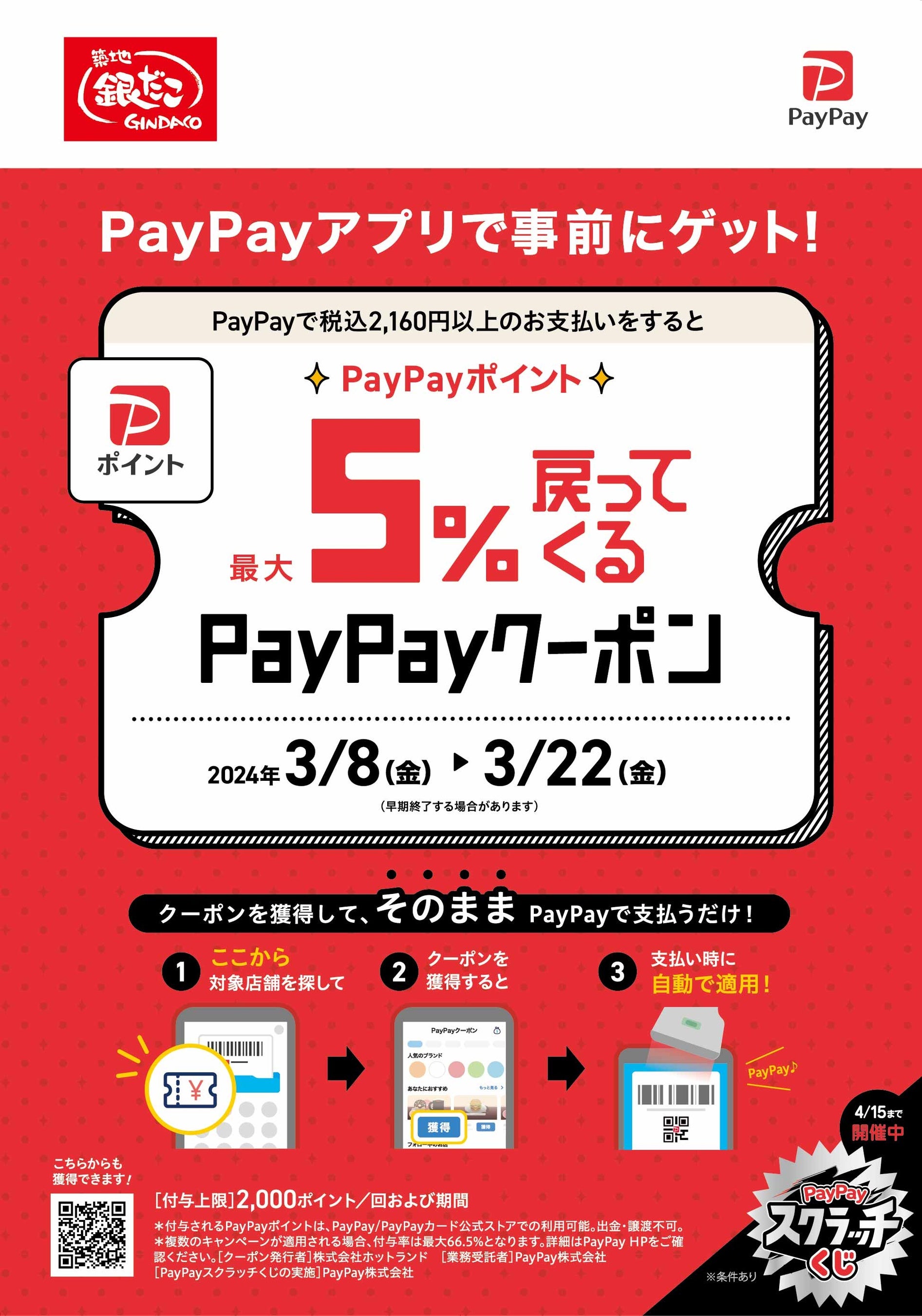 さらに!3月8日(金)から22日(金)の期間、最大5% 戻ってくる!クーポン の配布(※1)を実施いたします。 PayPayアプリで事前にクーポンをゲットし、築地銀だこの対象店舗 にて2,160円(税込)以上のお買い上げをPayPayでお支払い(※2)いただくと、最大5%のPaypayポイントが戻ってきます!
