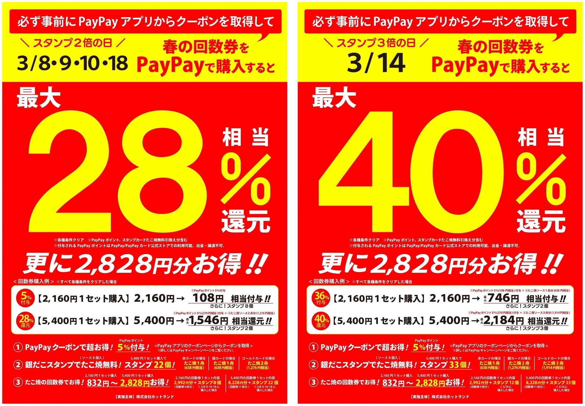 ただでさえ、“ぜったいお得な回数券“ を、PayPayクーポンの利用で最大5%のPayPayポイントが戻り、大創業祭(スタンプ2倍・3倍)期間中に購入すれば、あっという間にスタンプも貯まり、カードのランクアップやたこ焼も無料でもらえて超お得!今年の春も、このお得な機会をお見逃しなく!!!
