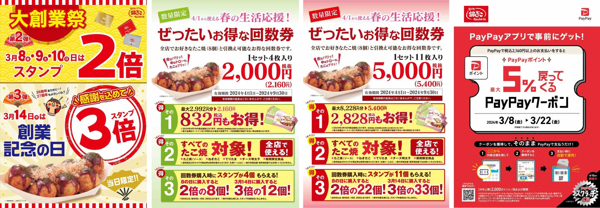 また、3月5日から築地銀だこ店舗(一部店舗を除く)で開催される 『大創業祭』 の 第2弾(3月8日、9日、10日)、第3弾(3月14日)に “ぜったいお得な回数券” をご購入いただくと、購入時に 「銀だこスタンプカード https://www.gindaco.com/stampcard/ 」 のスタンプもたくさんもらえて “超お得” !!(3月8日(金)、9日(土)、10日(日)に購入するとスタンプ2倍!、3月14日(木)の創業記念日に購入すると、なんとスタンプ3倍!!)