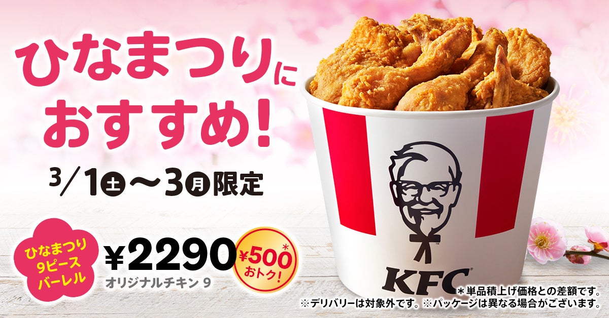 【ひなまつりには、KFCでしあわせを“とり“こもう】「オリジナルチキン」だけが9ピース入って500円もおトク!「ひなまつり9ピースバーレル」3月1日(土)から3日間限定で販売