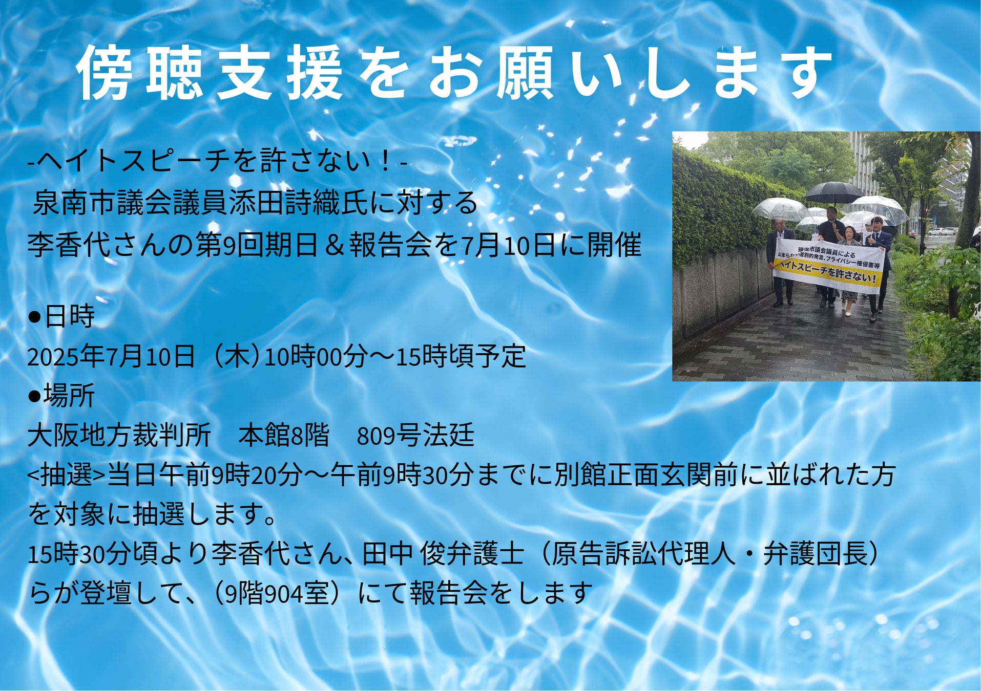 -ヘイトスピーチを許さない!- 泉南市議会議員添田詩織氏に対する役員の第9回期日の報告会を7月10日に開催