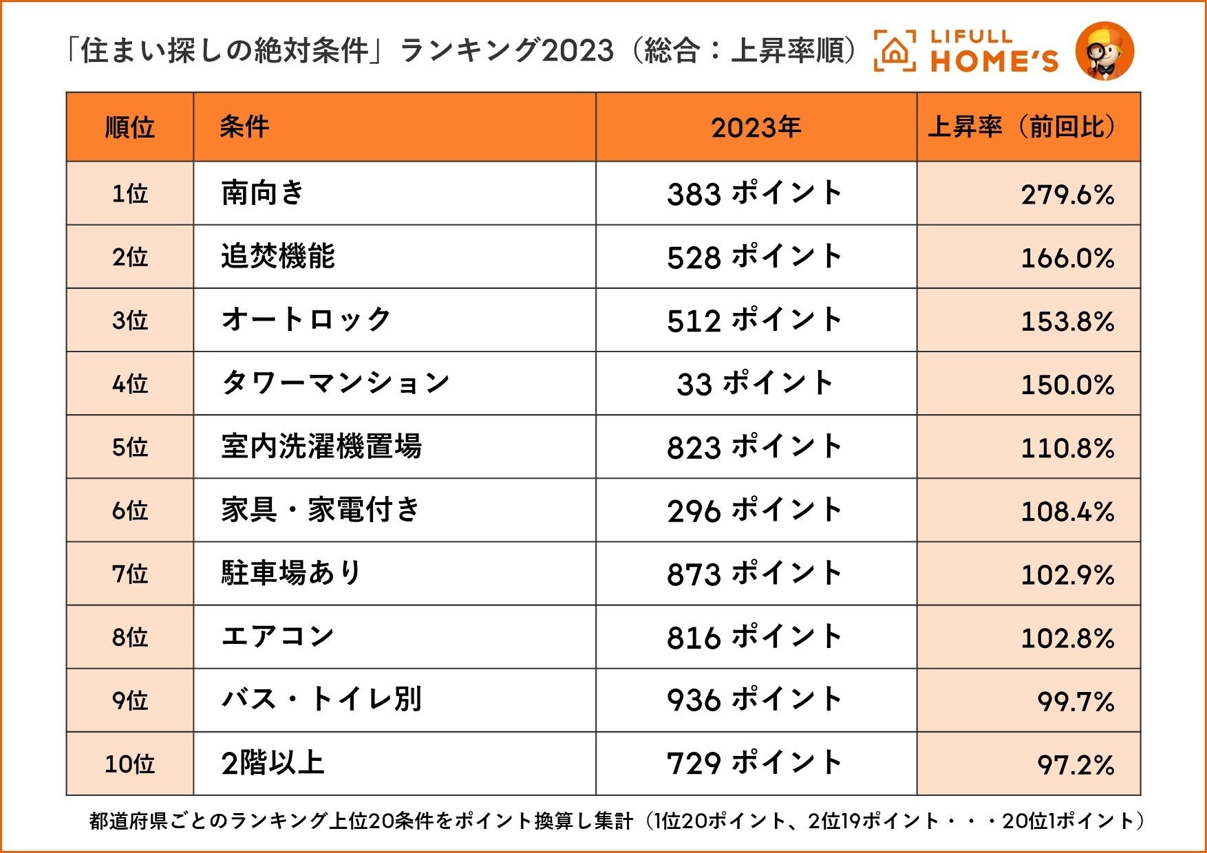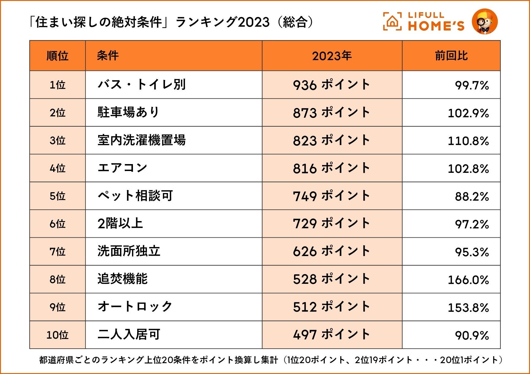 都道府県ごとのランキング上位20条件を1位から順に20ポイント、2位19ポイントとし、条件ごとに集計した総合ランキングで、1位「バス・トイレ別」936ポイントと唯一900ポイントを超えています。2位「駐車場あり」873ポイント、3位「室内洗濯機置場」823ポイント、4位「エアコン」816ポイントと続きます。「ペット相談可」「2階以上」「洗面所独立」も600ポイントを超え、住まい探しの7大「絶対条件」として他の条件に差をつけていますが、8位「追焚機能」と9位「オートロック」が前回比150%以上と、上位の7条件に追随しています。