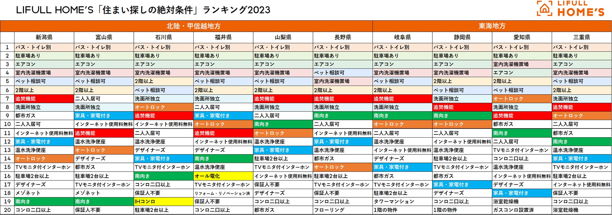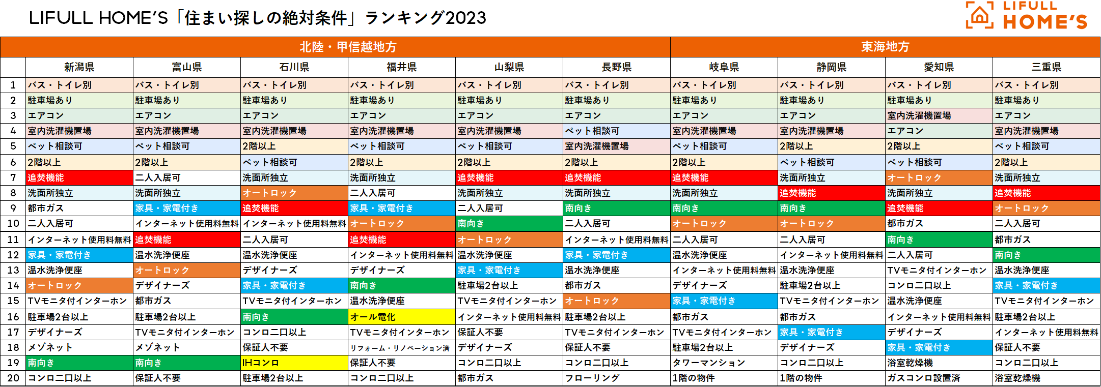 「南向き」は、山梨県(上昇幅2ランク)を除き、前回から5ランク以上上昇しています。富山県、福井県が11ランク、石川県、三重県が9ランクアップ、新潟県が8ランクアップし人気条件のTOP20に登場しました。富山県で「オートロック」が11ランクアップするなど、前回から7~8ランクの上昇が見られます。「家具・家電付き」は、北陸・甲信越・東海地方でもTOP20に入る人気条件です。また、オール電化の普及が進む富山県、石川県、福井県の北陸3県では今回も「オール電化」「IHコンロ」が他県と比べて上位に入りました。(富山県:「IHコンロ」21位、石川県:「オール電化」21位、福井県:「IHコンロ」22位)