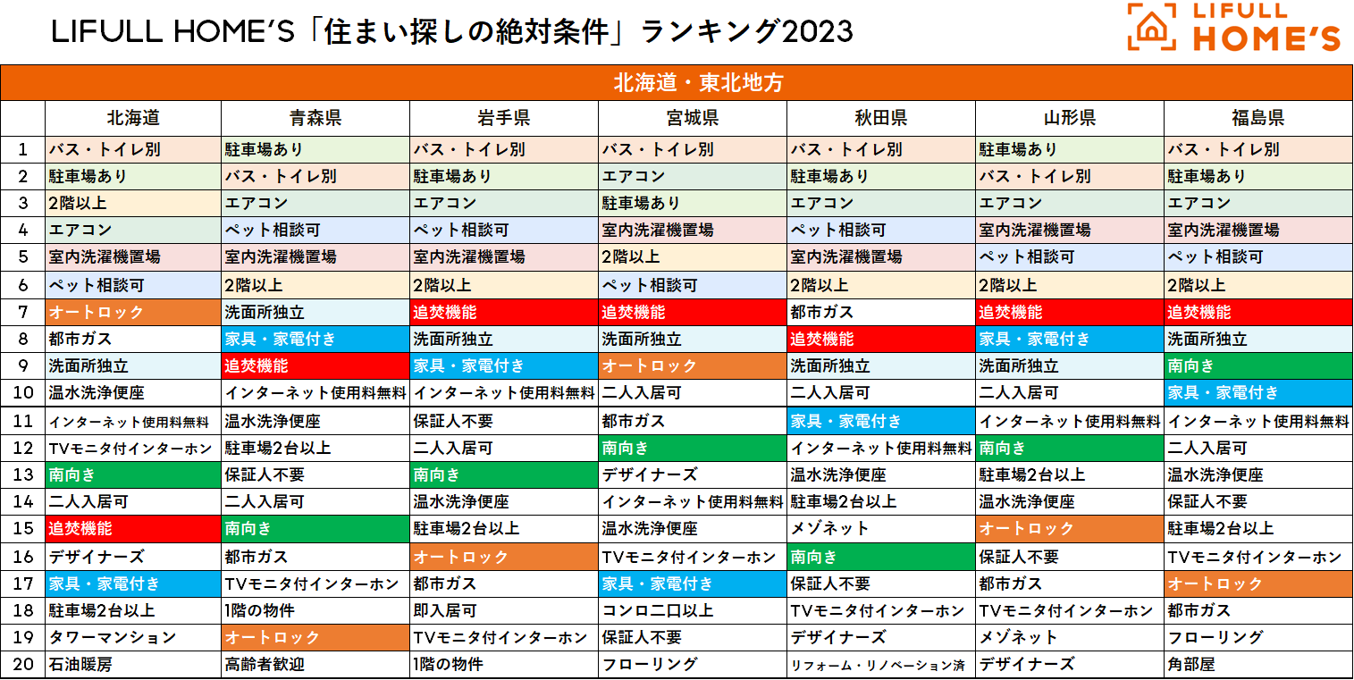 北海道・東北地方では、「追焚機能」が東北6県でTOP10、北海道も15位という結果で、「洗面所独立」よりも上回る地域がありました。東北地方に限っては、全国的にも順位を上げた条件の「南向き」よりも、さらに重視されていることが分かりました。また「家具・家電付き」が昨年に続き、すべての地域でTOP20に入り、北海道・東北地方での定番の人気条件であることが窺えます。「オートロック」は青森県が19位で、昨年の35位から16ランク上昇し、上昇幅が全国で最も大きくなり、秋田県では21位にランクインしています。